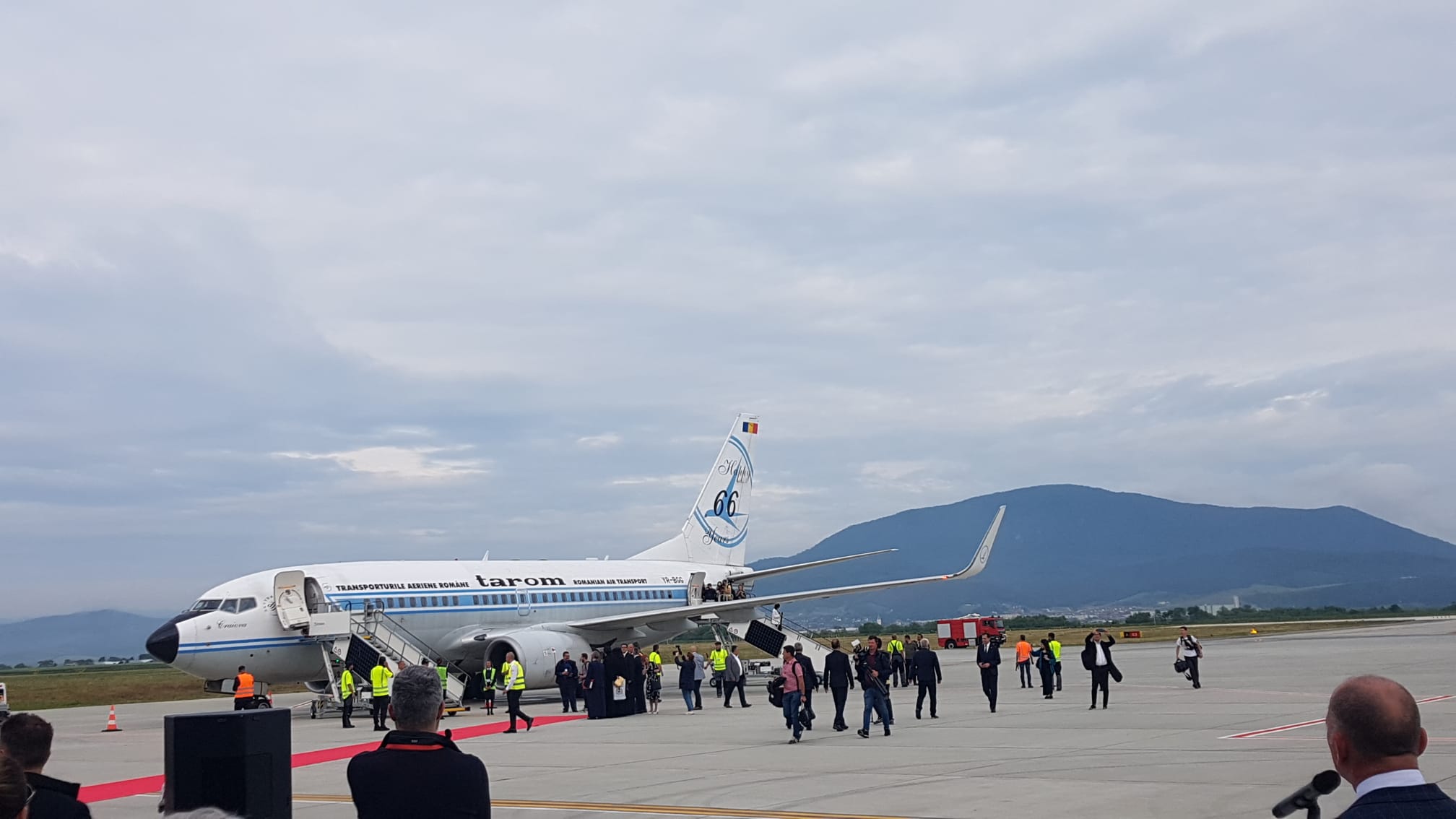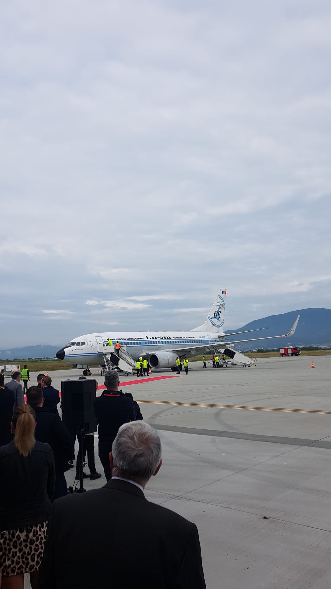 Primul avion a aterizat pe aeroportul Brașov-Ghimbav joi, 15 iunie 2023, la ora 8.30. A fost cursa care a inaugurat noul obiectiv realizat de Consiliul Județean Brașov, primul de acest tip din ultimii 50 de ani din România. Aparatul de zbor al companiei naţionale TAROM, pilotat de fiul lui Dumitru Prunariu, singurul cosmonaut pe care l-a dat România, a plecat de la București la ora 8.10, la bordul căruia au fost oficialii Adrian Veștea, președintele CJ Brașov, Nicolae Ciucă, fostul premier, Sorin Grindeanu, ministrul Transporturilor și alții. Cursa a fost întâmpinată pe aeroportul de la Brașov de reprezentanții administrațiilor publice locale din județ: CJ Brașov, primarii din județ. Mitropolitul Ardealului, Laurențiu Streza, a făcut parte din delegația care a întâmpinat pe aeroport aeronava. A fost prezent la zborul inaugural și Aristotel Căncescu, fostul președinte al CJ Brașov, cel care a inițiat investiția după anul 2000. După aterizare a fost tăiată panglica de către Adrian Veștea, Nicolae Ciucă și Sorin Grindeanu. A urmat o slujbă religioasă oficiată de mitropolitul Ardealului și preotul paroh de la Ghimbav.