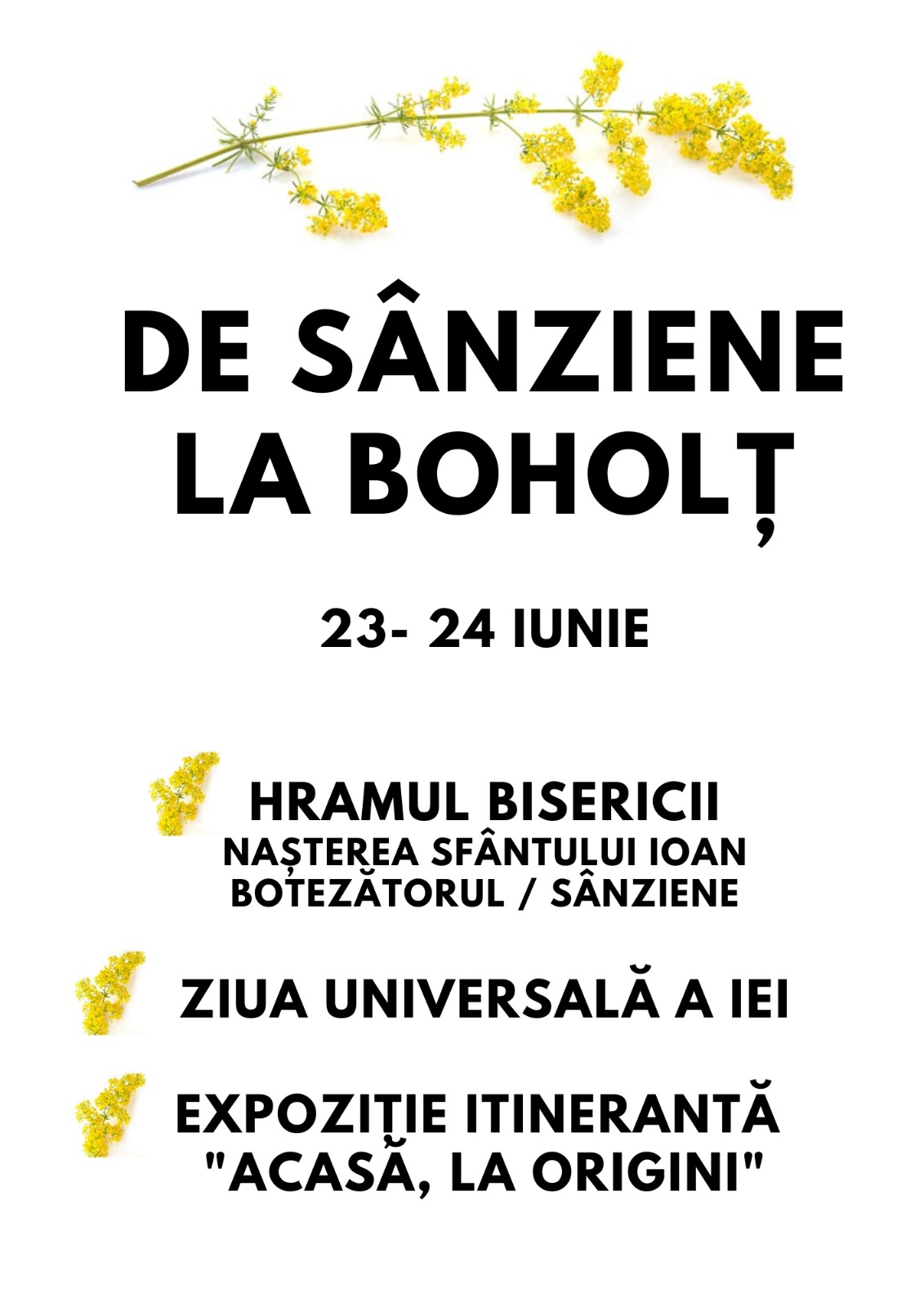 Sâmbătă la ora 9.45 va începe sfânta liturghie oficiată de mai mulți preoți. După slujbă se va organiza ritualul aruncatului sânzienelor, prezentarea expoziției de pictură „Pro Boholț”, a expoziției de fotografie veche din sat, prezentarea zestrei miresei, a uneltelor de lucru ale mirelui gospodar. La Căminul cultural se va organiza o agapă de post.