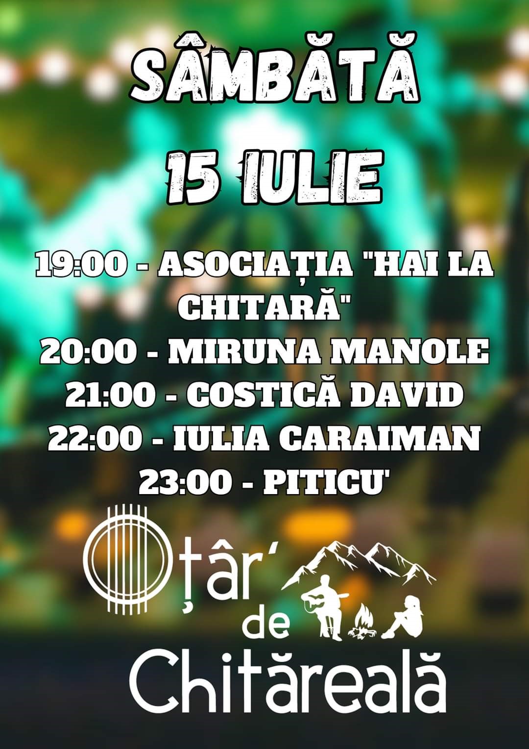 - Sâmbătă, 15 iulie, începând cu ora 16.00, se vor organiza concursuri cu premii. Vor urma concertele după ora 19.00: Asociația ,,Hai la Chitară“coordonată de preotul Marius Demeter, după care vor urma până târziu în noapte artiștii: Miruna Manole, Costică David, Iulia Caraiman și Piticu.