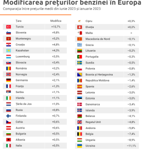 În primele șase luni ale anului 2023, prețurile la benzină în regiunea noastră au rămas stabile, conform analizei. În majoritatea țărilor europene, prețul benzinei din iunie a fost mai mic de 5% față de cel din ianuarie. Doar în Turcia și Slovenia benzina s-a scumpit semnificativ – 16% și, respectiv, 10%. În Ucraina și Ungaria, benzina a fost mai ieftină decât în ianuarie – cu 11% și, respectiv, 9%.