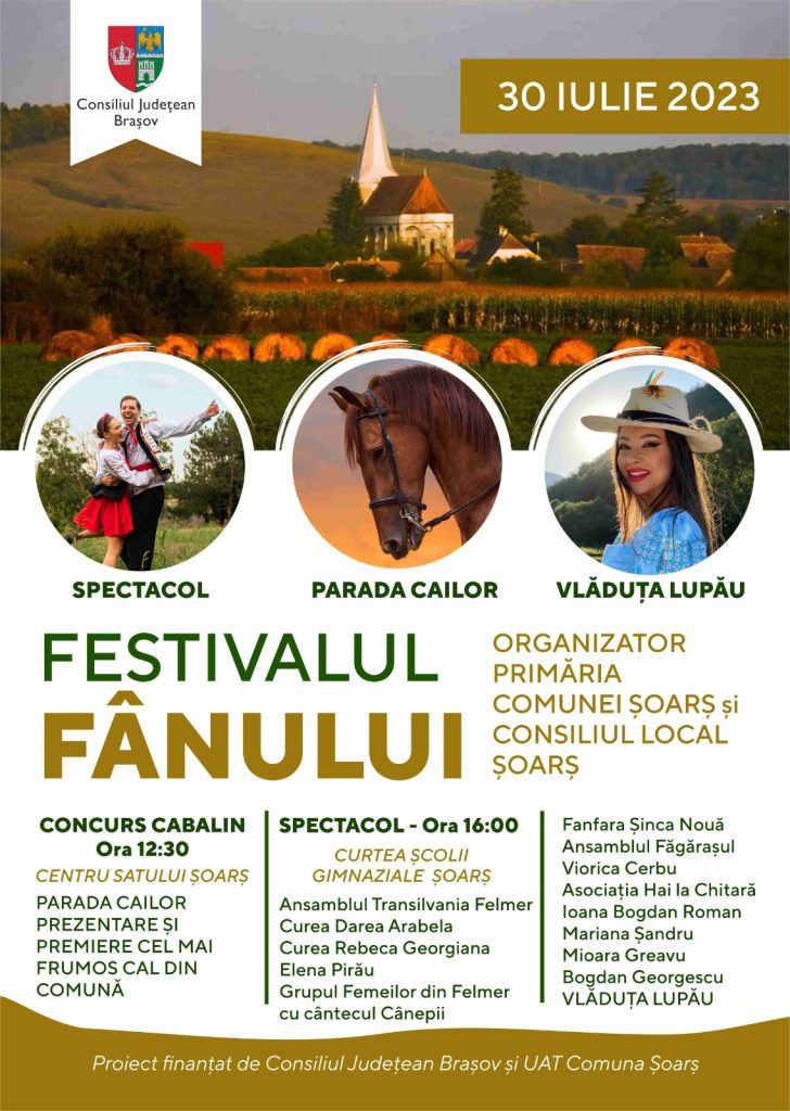 - un concurs cabalin dedicat amatorilor, crescători de cai din comuna Șoarș – orele 12:30. Locuitorii Comunei se pot înscrie în concurs până la data de 24.07.2023, orele 16:00 la sediul Primăriei Șoars.