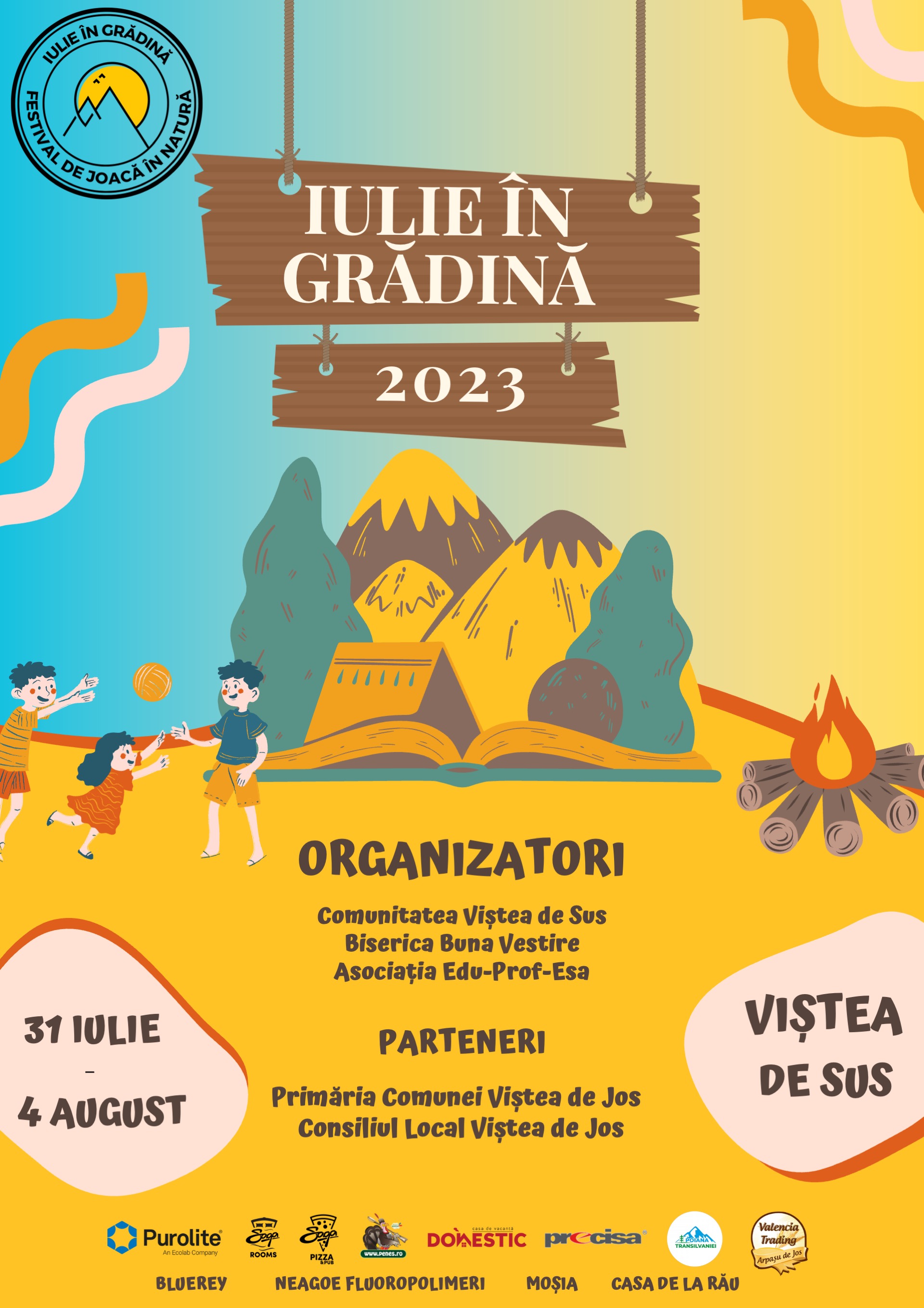 A treia ediție a festivalului de joacă în natură, ,,Iulie în grădină”, va avea loc între 31 iulie și 4 august, în Viștea de Sus. În programul evenimentului se regăsesc jocuri, concursuri, drumeții, povești, teatru, film, karaoke, zumba, dar și ateliere de carte și de povești pentru copii de toate vârstele.