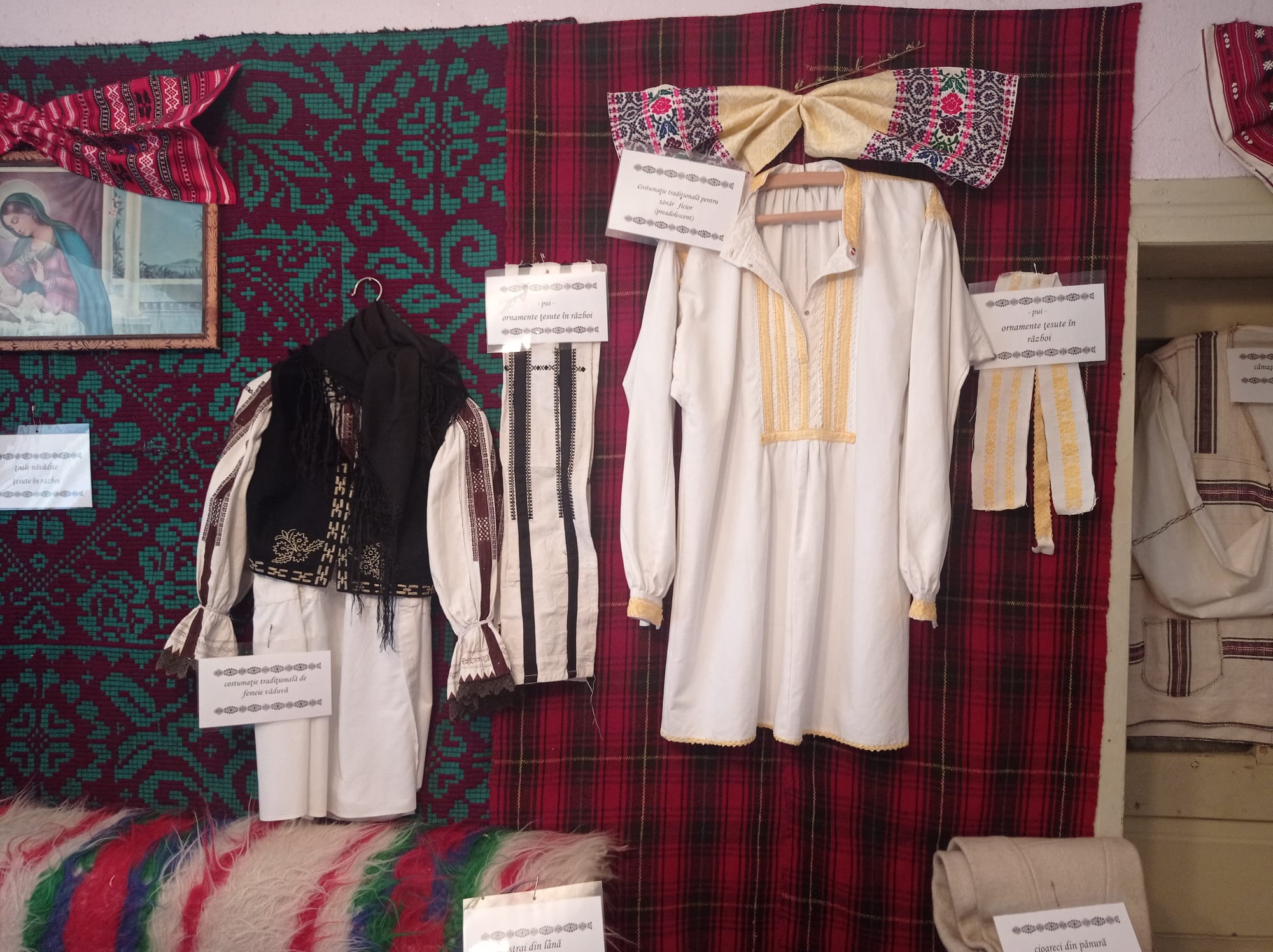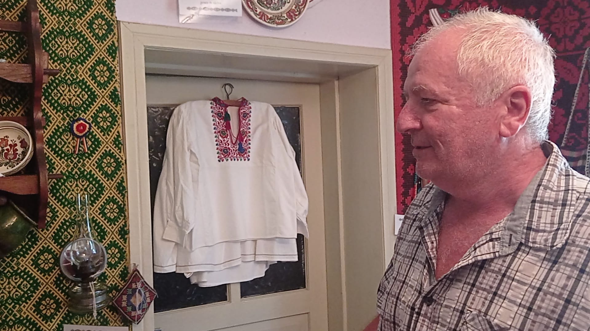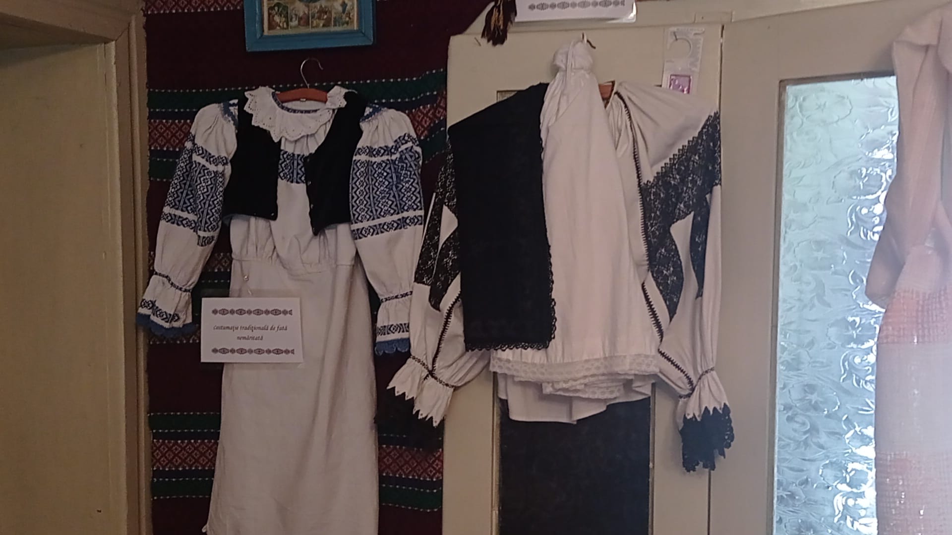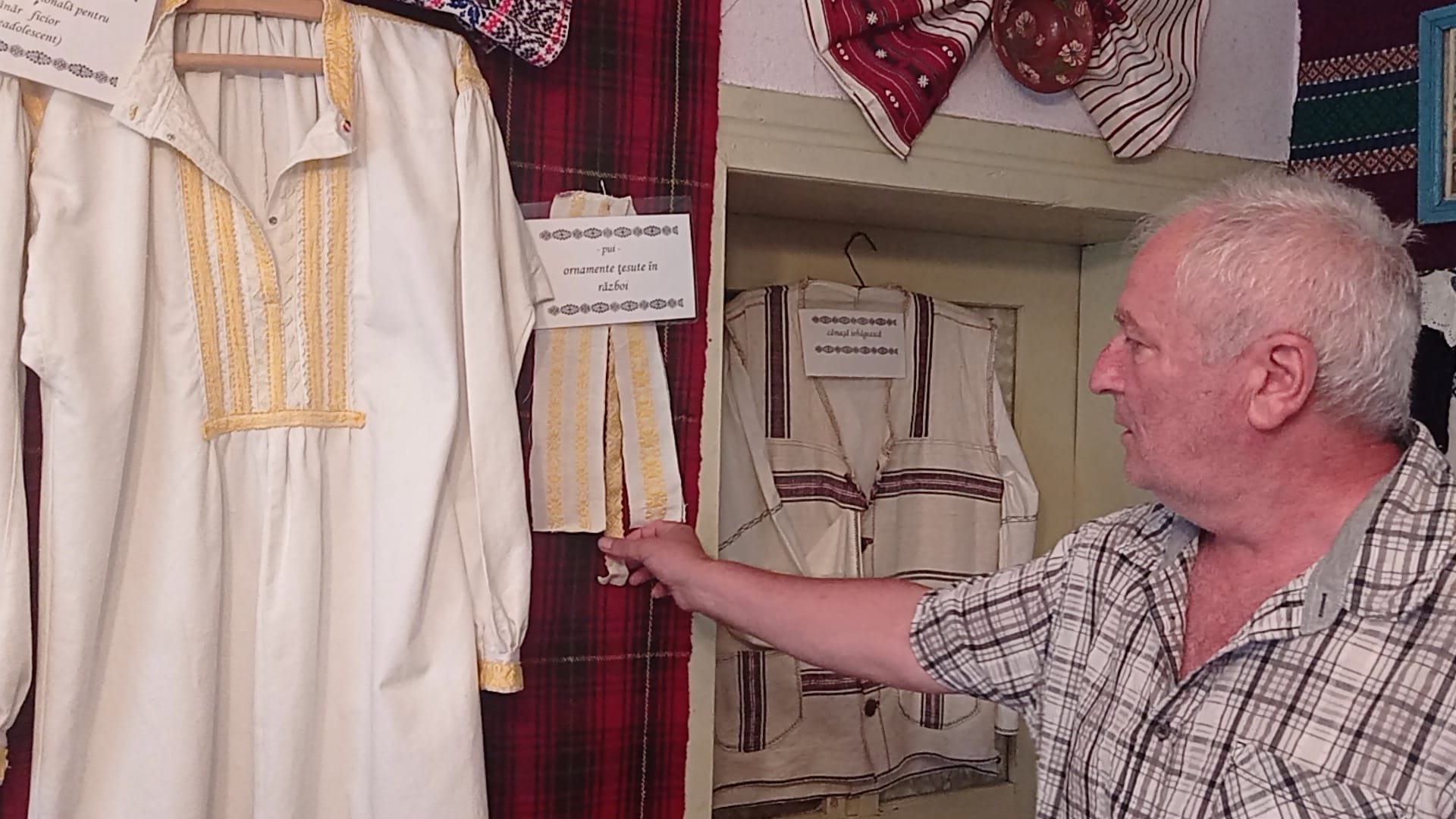 O casă albastră te introduce într-o lume ireală, de basm, o curte din poeziile lui Eminescu, cu flori, copaci speciali, ce continuă în fund cu o adevărată grădină botanică și lespezi culese din zona lacului Bâlea sau Transalpina, fiecare cu povestea ei. În casă te întâmpină războaiele de țesut și camerele în care sunt depozitate veșmintele românești, dar și instrumentele tradiționale de cântat: fluiere, cavale, tulnice, cobze etc. ,,Multă vreme, chiar și în perioada interbelică și postbelică, mult după cel de-al doilea război mondial, îmbrăcămintea și hrana se făceau doar în gospodăriile oamenilor de la țară. Înainte, oamenii de la țară, noi vorbim acum de cei din Țara Făgărașului, își făceau îmbrăcămintea în propria curte, foarte târziu au apărut la noi magazinele cu îmbrăcăminte. M-am gândit să readuc în actualitate povestea satului făgărășean. După cum vedeți, avem aici ștergare făcute de mine sau culese din alte părți, care sunt foarte practice, pentru că usucă repede mâna când te ștergi cu ele, vedeți aici o butelcă din lemn pentru nuntă, o geantă veche din piele, un baston de cetaș, o traistă de jude, iar ștergarele de cânepă sunt țesute în război, ștergare de arnică, lampă cu petrol, chindeauă țesute în război, cârpă pentru înmormântare, cârpă pentru coș de plocon, pălărie de băciță, pălărie de baci sau țoale năvădite țesute în război. Vedeți aici o costumație tradițională de femeie văduvă, după cum observați persistă culoarea neagră. Avem pui cu ornamente țesute în război, costumație tradițională pentru tânăr fecior. Observați aici această ,,cămașă de iobag” pentru că era foarte rezistentă la muncă, căreia eu i-am atașat nasturi de lemn. Vedeți   un strai de lână pentru pat, bătut la piuă. Pe jos, după cum observați, sunt preșuri din cârpe țesute la război, apoi lada din lemn sau ,,lădoi”, toate ne amintesc de îmbrăcămintea părinților și a bunicilor noștri. Blidarul prins în perete, cu blide, este la loc de cinste și el. Avem  opinci, apoi costumație tradițională de femeie măritată, costumație tradițională de fată nemăritată și costume femeiești din Țara Făgărașului. Aici avem un cheptar bărbătesc înfundat, cu brînaș, opturi și onuri, cusut pe piele de ozie. Am lucrat un an de zile la acest cheptar, este o muncă migăloasă care, uneori, mi-a luat și câte patru ceasuri pe zi. Avem un alt cheptar bărbătesc înfundat, cu brînaș, opturi și onuri cusut pe piele de oaie. Aici avem o zeghe pentru vreme rece și un recăl, tot pentru sezonul rece. Mai observați   o cheptăriță de femei cusută pe piele de oaie. Avem și costumație tradițională de boreasă” este povestea costumelor tradiționale depănată de Sorin Petrișor.