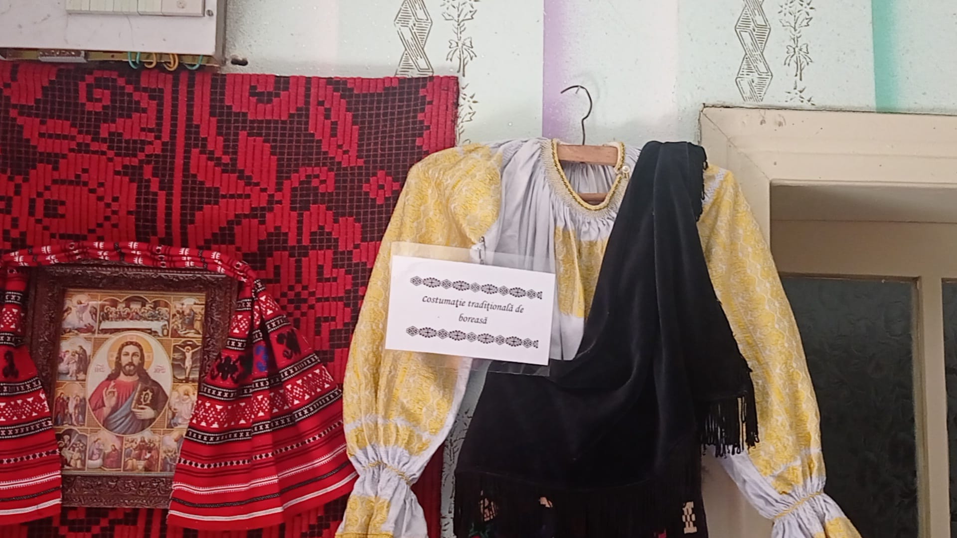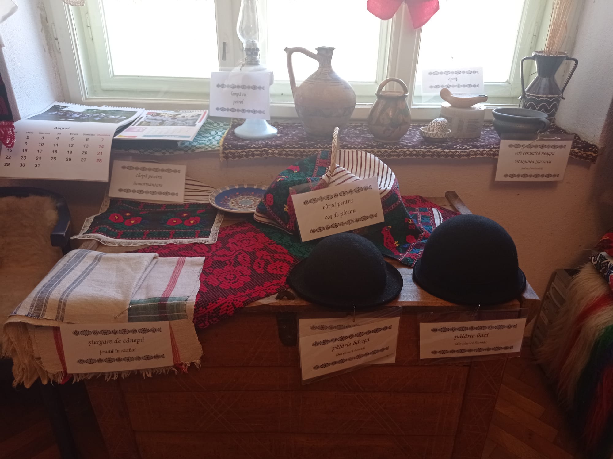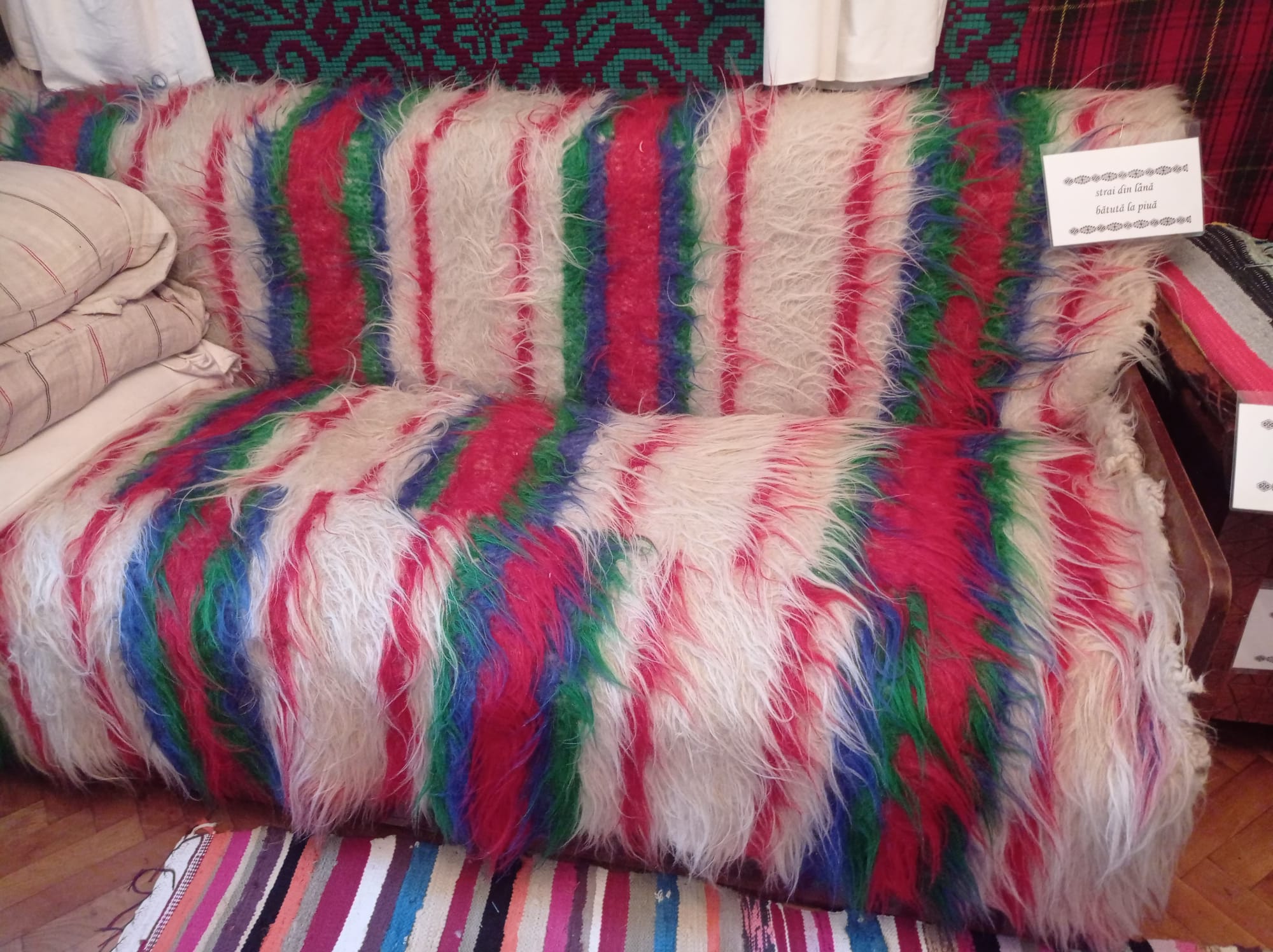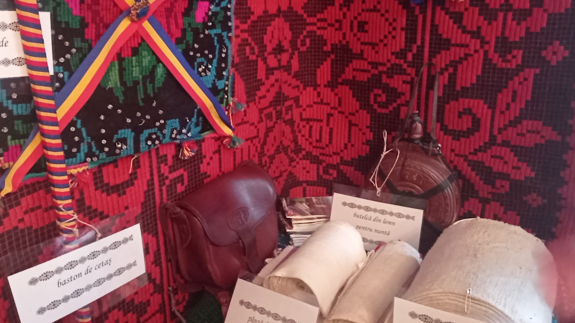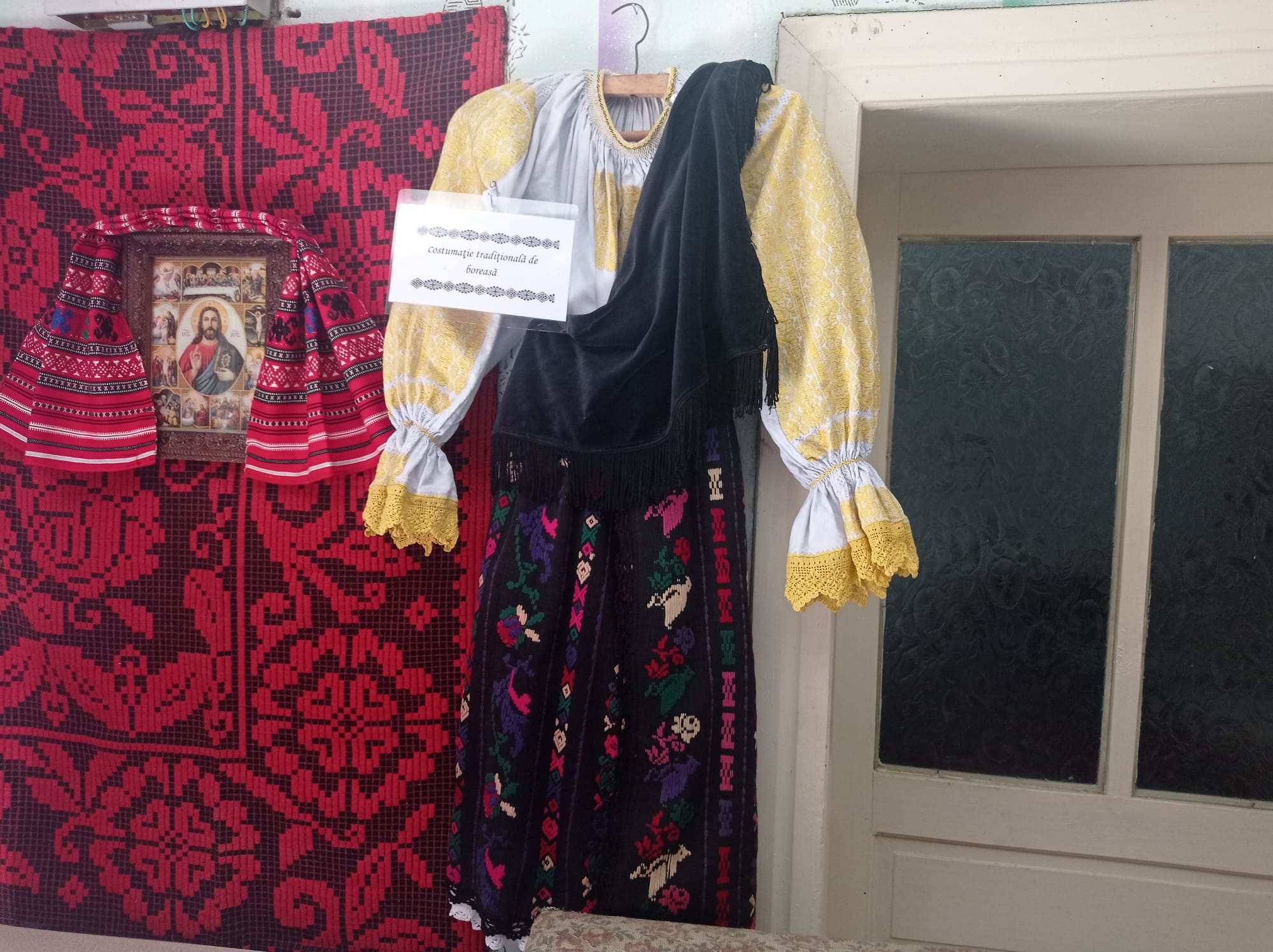 O casă albastră te introduce într-o lume ireală, de basm, o curte din poeziile lui Eminescu, cu flori, copaci speciali, ce continuă în fund cu o adevărată grădină botanică și lespezi culese din zona lacului Bâlea sau Transalpina, fiecare cu povestea ei. În casă te întâmpină războaiele de țesut și camerele în care sunt depozitate veșmintele românești, dar și instrumentele tradiționale de cântat: fluiere, cavale, tulnice, cobze etc. ,,Multă vreme, chiar și în perioada interbelică și postbelică, mult după cel de-al doilea război mondial, îmbrăcămintea și hrana se făceau doar în gospodăriile oamenilor de la țară. Înainte, oamenii de la țară, noi vorbim acum de cei din Țara Făgărașului, își făceau îmbrăcămintea în propria curte, foarte târziu au apărut la noi magazinele cu îmbrăcăminte. M-am gândit să readuc în actualitate povestea satului făgărășean. După cum vedeți, avem aici ștergare făcute de mine sau culese din alte părți, care sunt foarte practice, pentru că usucă repede mâna când te ștergi cu ele, vedeți aici o butelcă din lemn pentru nuntă, o geantă veche din piele, un baston de cetaș, o traistă de jude, iar ștergarele de cânepă sunt țesute în război, ștergare de arnică, lampă cu petrol, chindeauă țesute în război, cârpă pentru înmormântare, cârpă pentru coș de plocon, pălărie de băciță, pălărie de baci sau țoale năvădite țesute în război. Vedeți aici o costumație tradițională de femeie văduvă, după cum observați persistă culoarea neagră. Avem pui cu ornamente țesute în război, costumație tradițională pentru tânăr fecior. Observați aici această ,,cămașă de iobag” pentru că era foarte rezistentă la muncă, căreia eu i-am atașat nasturi de lemn. Vedeți   un strai de lână pentru pat, bătut la piuă. Pe jos, după cum observați, sunt preșuri din cârpe țesute la război, apoi lada din lemn sau ,,lădoi”, toate ne amintesc de îmbrăcămintea părinților și a bunicilor noștri. Blidarul prins în perete, cu blide, este la loc de cinste și el. Avem  opinci, apoi costumație tradițională de femeie măritată, costumație tradițională de fată nemăritată și costume femeiești din Țara Făgărașului. Aici avem un cheptar bărbătesc înfundat, cu brînaș, opturi și onuri, cusut pe piele de ozie. Am lucrat un an de zile la acest cheptar, este o muncă migăloasă care, uneori, mi-a luat și câte patru ceasuri pe zi. Avem un alt cheptar bărbătesc înfundat, cu brînaș, opturi și onuri cusut pe piele de oaie. Aici avem o zeghe pentru vreme rece și un recăl, tot pentru sezonul rece. Mai observați   o cheptăriță de femei cusută pe piele de oaie. Avem și costumație tradițională de boreasă” este povestea costumelor tradiționale depănată de Sorin Petrișor.