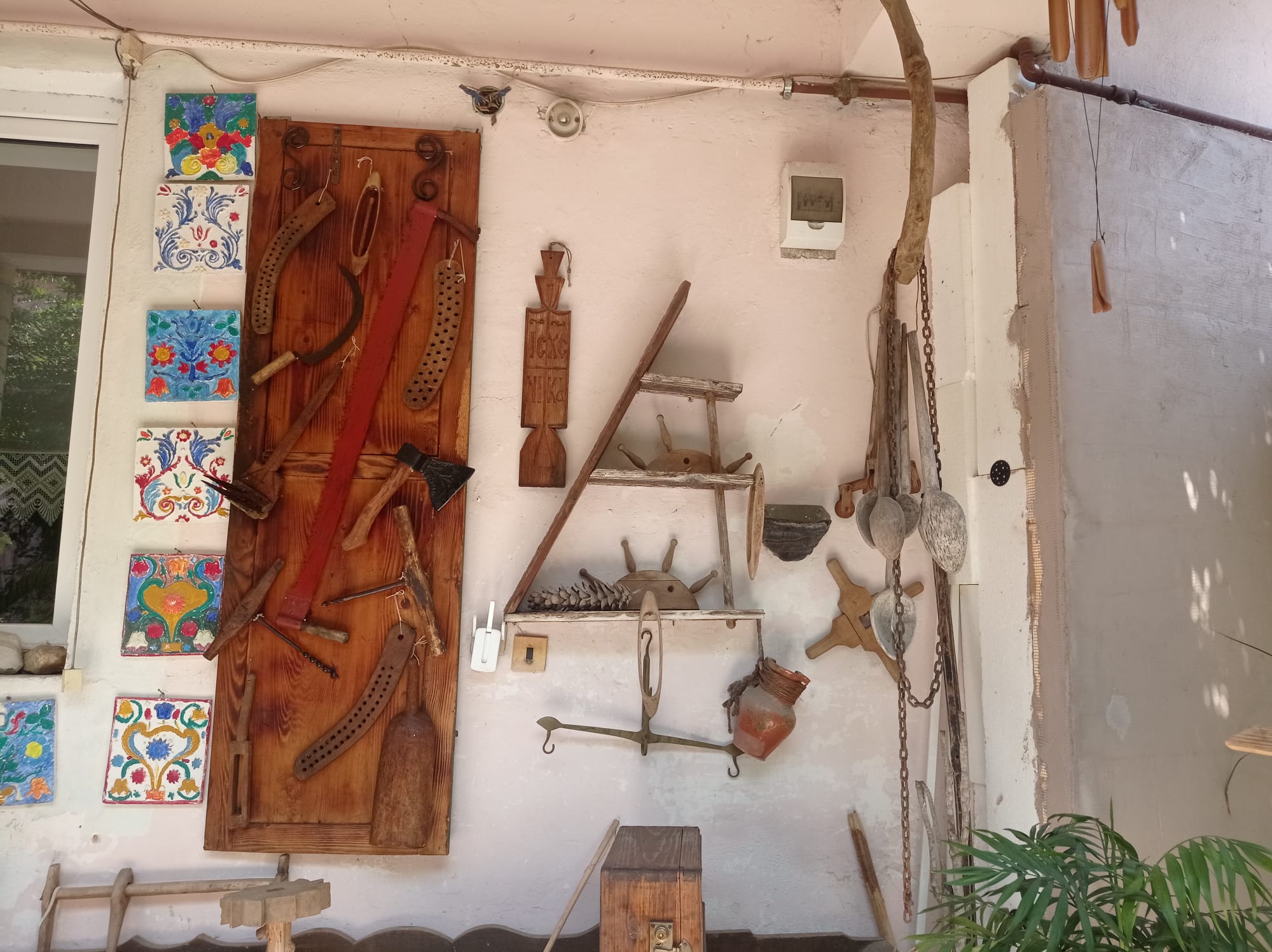 În curte sunt expuse secere, topoare, o roată, unelte de dulgherit, valiză de cătănie, ciubăr și alte lucruri care te duc chiar și cu șaptezeci de ani în urmă. ,,Când un om își construia o casă toți vecinii veneau să-l ajute, făceau clacă pentru el. Oamenii din sat se ajutau mereu între ei, nimeni nu era singur, simțeai că ești într-o comunitate vie, așa trăiau bunicii noștri” explică Sorin Petrișor. Lăzi, unelte de meșterit adunate de prin mai toate satele Țării Făgărașului și alte localități din Ardeal îți aduc aminte de vatra de odinioară. ,,Am o adevărată colecție de linguri din lemn pentru că sunt preocupat și de arta culinară” spune Sorin Petrișor.