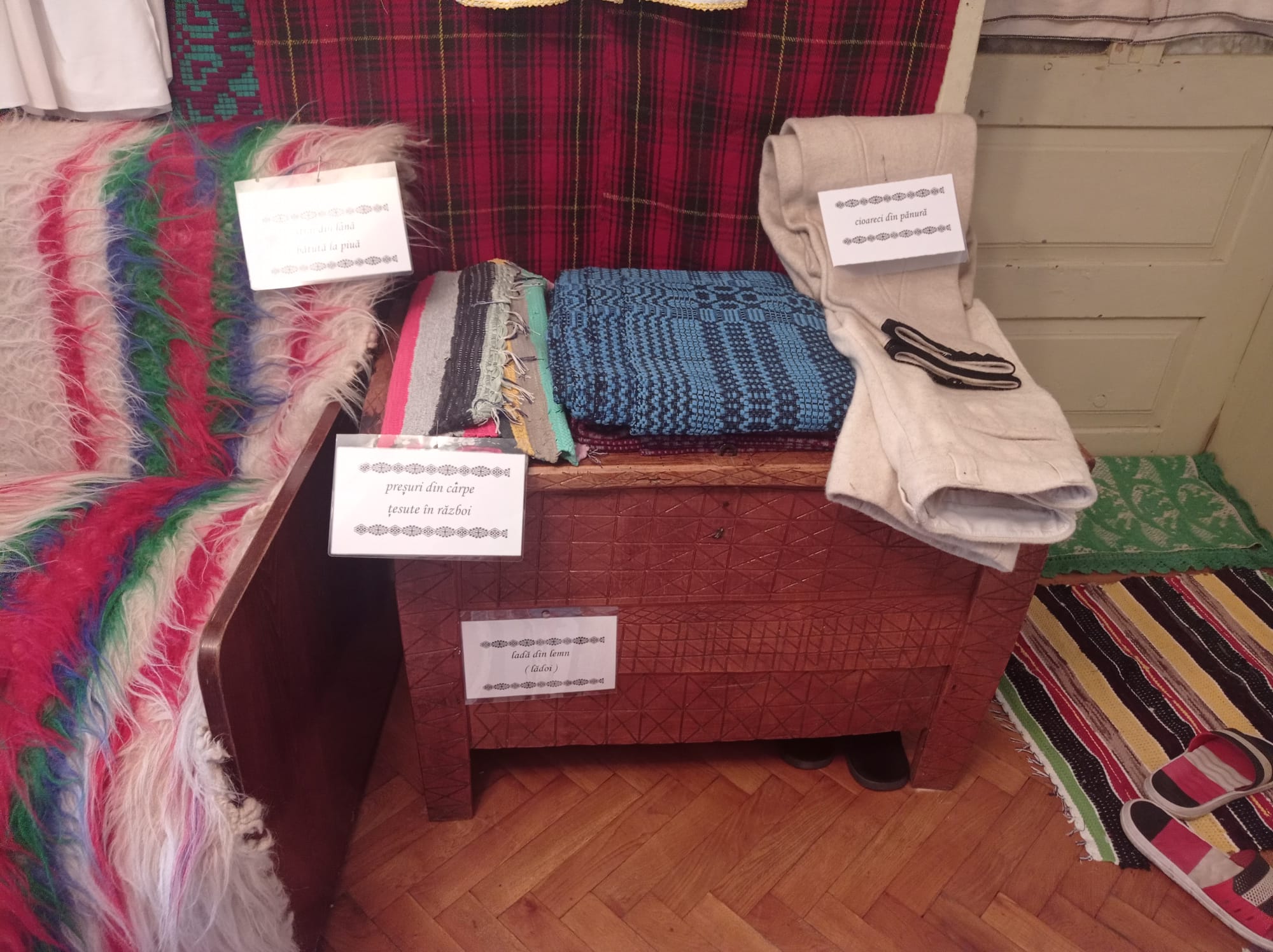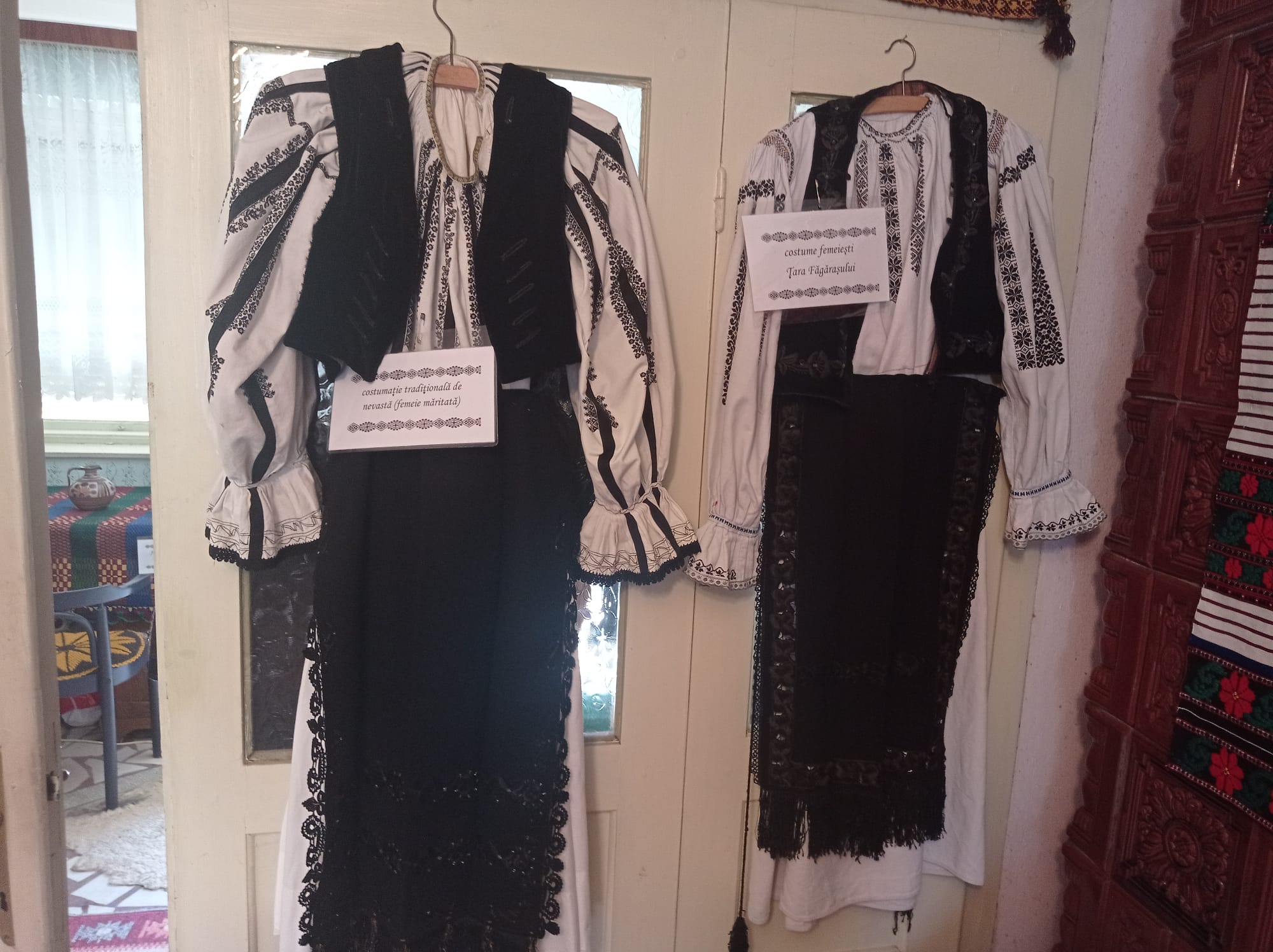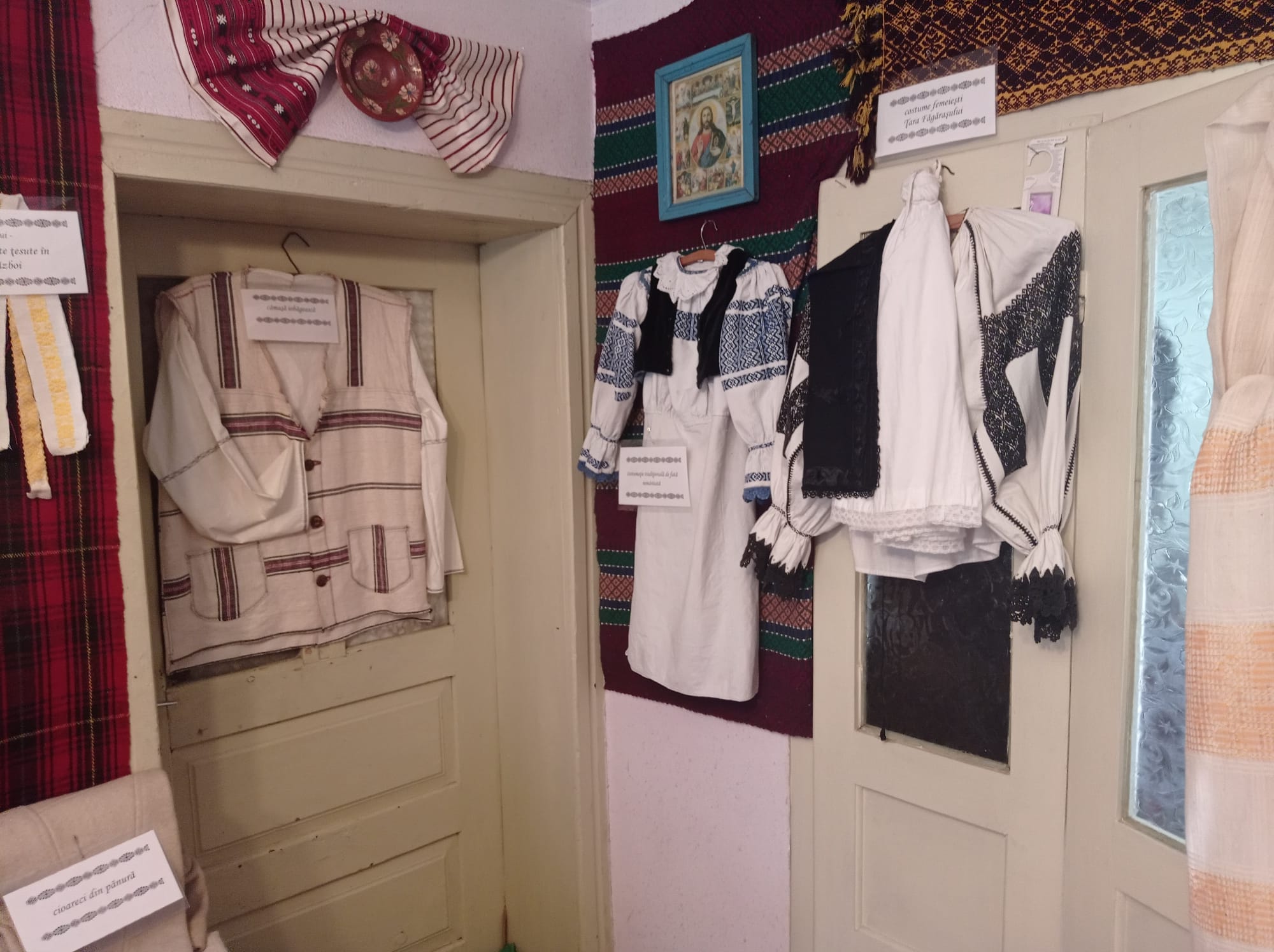 O casă albastră te introduce într-o lume ireală, de basm, o curte din poeziile lui Eminescu, cu flori, copaci speciali, ce continuă în fund cu o adevărată grădină botanică și lespezi culese din zona lacului Bâlea sau Transalpina, fiecare cu povestea ei. În casă te întâmpină războaiele de țesut și camerele în care sunt depozitate veșmintele românești, dar și instrumentele tradiționale de cântat: fluiere, cavale, tulnice, cobze etc. ,,Multă vreme, chiar și în perioada interbelică și postbelică, mult după cel de-al doilea război mondial, îmbrăcămintea și hrana se făceau doar în gospodăriile oamenilor de la țară. Înainte, oamenii de la țară, noi vorbim acum de cei din Țara Făgărașului, își făceau îmbrăcămintea în propria curte, foarte târziu au apărut la noi magazinele cu îmbrăcăminte. M-am gândit să readuc în actualitate povestea satului făgărășean. După cum vedeți, avem aici ștergare făcute de mine sau culese din alte părți, care sunt foarte practice, pentru că usucă repede mâna când te ștergi cu ele, vedeți aici o butelcă din lemn pentru nuntă, o geantă veche din piele, un baston de cetaș, o traistă de jude, iar ștergarele de cânepă sunt țesute în război, ștergare de arnică, lampă cu petrol, chindeauă țesute în război, cârpă pentru înmormântare, cârpă pentru coș de plocon, pălărie de băciță, pălărie de baci sau țoale năvădite țesute în război. Vedeți aici o costumație tradițională de femeie văduvă, după cum observați persistă culoarea neagră. Avem pui cu ornamente țesute în război, costumație tradițională pentru tânăr fecior. Observați aici această ,,cămașă de iobag” pentru că era foarte rezistentă la muncă, căreia eu i-am atașat nasturi de lemn. Vedeți un strai de lână pentru pat, bătut la piuă. Pe jos, după cum observați, sunt preșuri din cârpe țesute la război, apoi lada din lemn sau ,,lădoi”, toate ne amintesc de îmbrăcămintea părinților și a bunicilor noștri. Blidarul prins în perete, cu blide, este la loc de cinste și el. Avem opinci, apoi costumație tradițională de femeie măritată, costumație tradițională de fată nemăritată și costume femeiești din Țara Făgărașului. Aici avem un cheptar bărbătesc înfundat, cu brînaș, opturi și onuri, cusut pe piele de ozie. Am lucrat un an de zile la acest cheptar, este o muncă migăloasă care, uneori, mi-a luat și câte patru ceasuri pe zi. Avem un alt cheptar bărbătesc înfundat, cu brînaș, opturi și onuri cusut pe piele de oaie. Aici avem o zeghe pentru vreme rece și un recăl, tot pentru sezonul rece. Mai observați o cheptăriță de femei cusută pe piele de oaie. Avem și costumație tradițională de boreasă” este povestea costumelor tradiționale depănată de Sorin Petrișor.