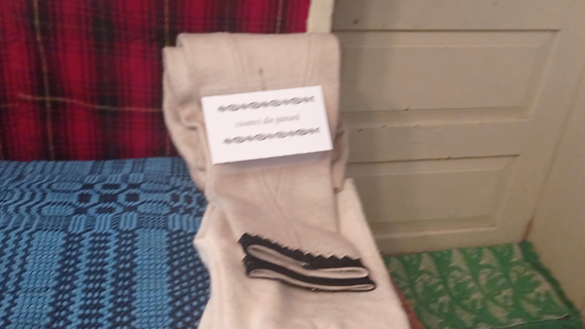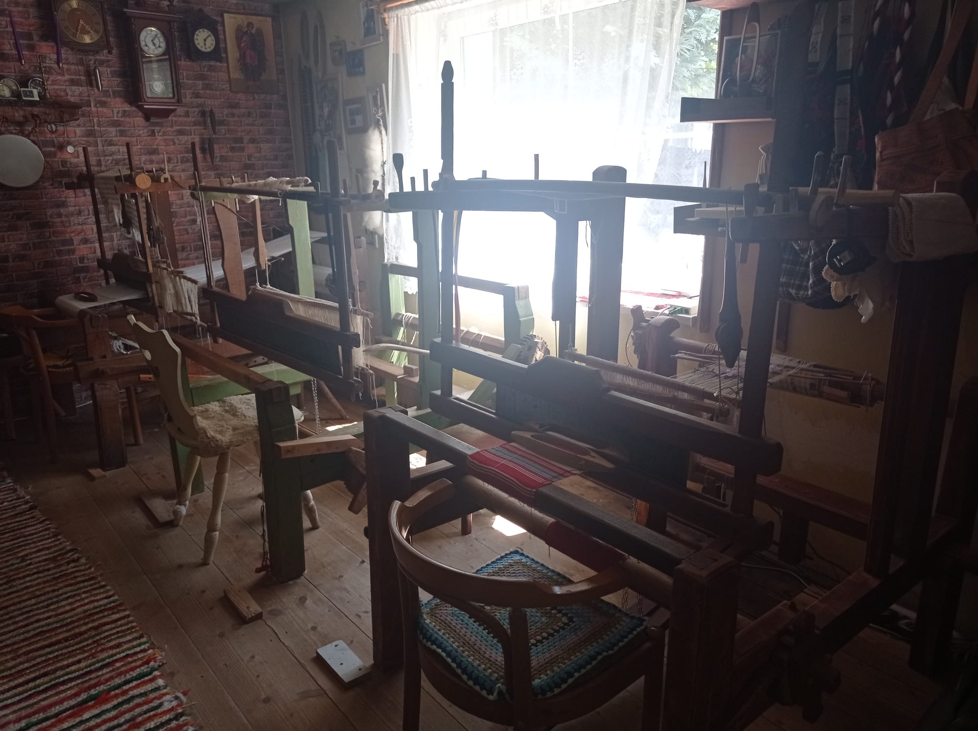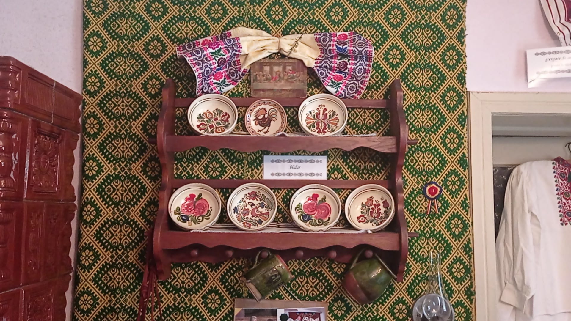 O casă albastră te introduce într-o lume ireală, de basm, o curte din poeziile lui Eminescu, cu flori, copaci speciali, ce continuă în fund cu o adevărată grădină botanică și lespezi culese din zona lacului Bâlea sau Transalpina, fiecare cu povestea ei. În casă te întâmpină războaiele de țesut și camerele în care sunt depozitate veșmintele românești, dar și instrumentele tradiționale de cântat: fluiere, cavale, tulnice, cobze etc. ,,Multă vreme, chiar și în perioada interbelică și postbelică, mult după cel de-al doilea război mondial, îmbrăcămintea și hrana se făceau doar în gospodăriile oamenilor de la țară. Înainte, oamenii de la țară, noi vorbim acum de cei din Țara Făgărașului, își făceau îmbrăcămintea în propria curte, foarte târziu au apărut la noi magazinele cu îmbrăcăminte. M-am gândit să readuc în actualitate povestea satului făgărășean. După cum vedeți, avem aici ștergare făcute de mine sau culese din alte părți, care sunt foarte practice, pentru că usucă repede mâna când te ștergi cu ele, vedeți aici o butelcă din lemn pentru nuntă, o geantă veche din piele, un baston de cetaș, o traistă de jude, iar ștergarele de cânepă sunt țesute în război, ștergare de arnică, lampă cu petrol, chindeauă țesute în război, cârpă pentru înmormântare, cârpă pentru coș de plocon, pălărie de băciță, pălărie de baci sau țoale năvădite țesute în război. Vedeți aici o costumație tradițională de femeie văduvă, după cum observați persistă culoarea neagră. Avem pui cu ornamente țesute în război, costumație tradițională pentru tânăr fecior. Observați aici această ,,cămașă de iobag” pentru că era foarte rezistentă la muncă, căreia eu i-am atașat nasturi de lemn. Vedeți un strai de lână pentru pat, bătut la piuă. Pe jos, după cum observați, sunt preșuri din cârpe țesute la război, apoi lada din lemn sau ,,lădoi”, toate ne amintesc de îmbrăcămintea părinților și a bunicilor noștri. Blidarul prins în perete, cu blide, este la loc de cinste și el. Avem opinci, apoi costumație tradițională de femeie măritată, costumație tradițională de fată nemăritată și costume femeiești din Țara Făgărașului. Aici avem un cheptar bărbătesc înfundat, cu brînaș, opturi și onuri, cusut pe piele de ozie. Am lucrat un an de zile la acest cheptar, este o muncă migăloasă care, uneori, mi-a luat și câte patru ceasuri pe zi. Avem un alt cheptar bărbătesc înfundat, cu brînaș, opturi și onuri cusut pe piele de oaie. Aici avem o zeghe pentru vreme rece și un recăl, tot pentru sezonul rece. Mai observați o cheptăriță de femei cusută pe piele de oaie. Avem și costumație tradițională de boreasă” este povestea costumelor tradiționale depănată de Sorin Petrișor.