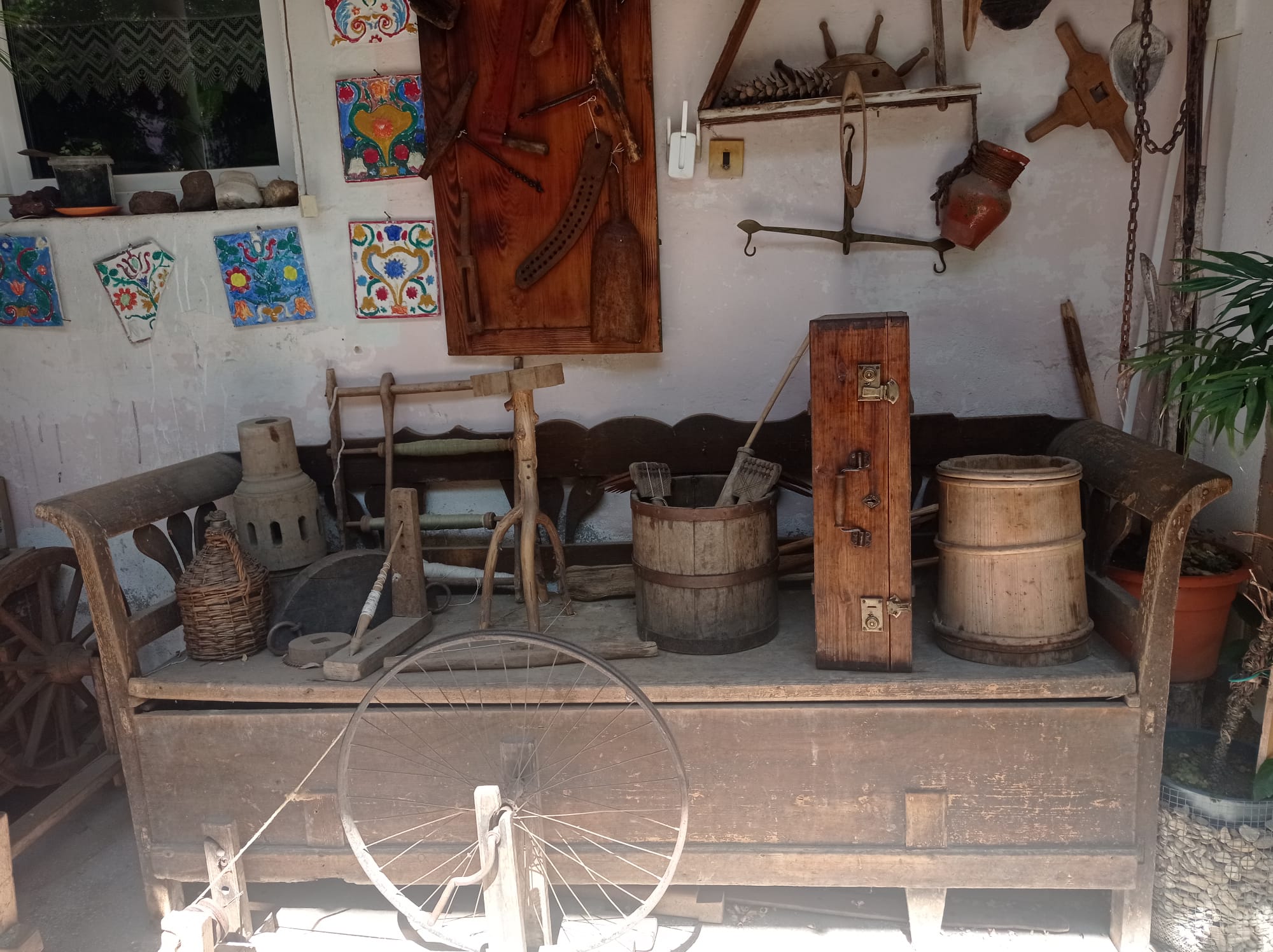 În curte sunt expuse secere, topoare, o roată, unelte de dulgherit, valiză de cătănie, ciubăr și alte lucruri care te duc chiar și cu șaptezeci de ani în urmă. ,,Când un om își construia o casă toți vecinii veneau să-l ajute, făceau clacă pentru el. Oamenii din sat se ajutau mereu între ei, nimeni nu era singur, simțeai că ești într-o comunitate vie, așa trăiau bunicii noștri” explică Sorin Petrișor. Lăzi, unelte de meșterit adunate de prin mai toate satele Țării Făgărașului și alte localități din Ardeal îți aduc aminte de vatra de odinioară. ,,Am o adevărată colecție de linguri din lemn pentru că sunt preocupat și de arta culinară” spune Sorin Petrișor.