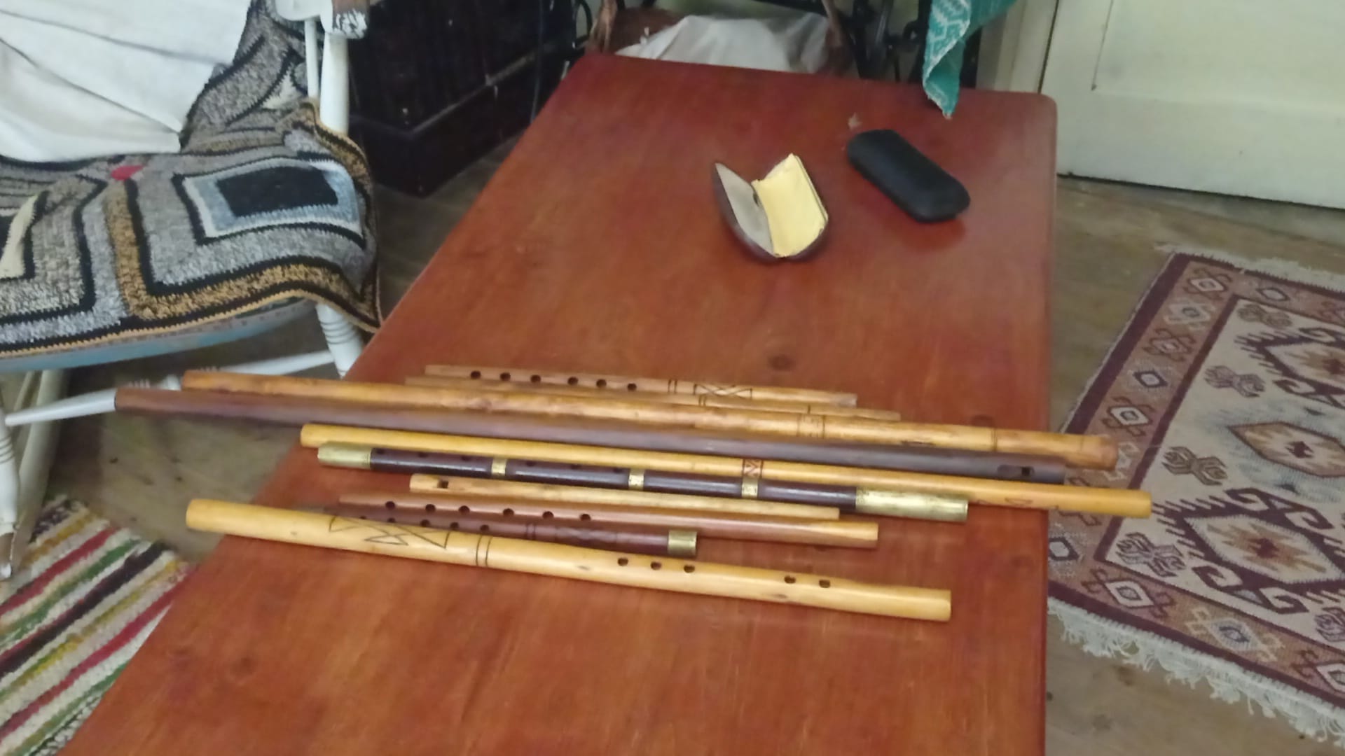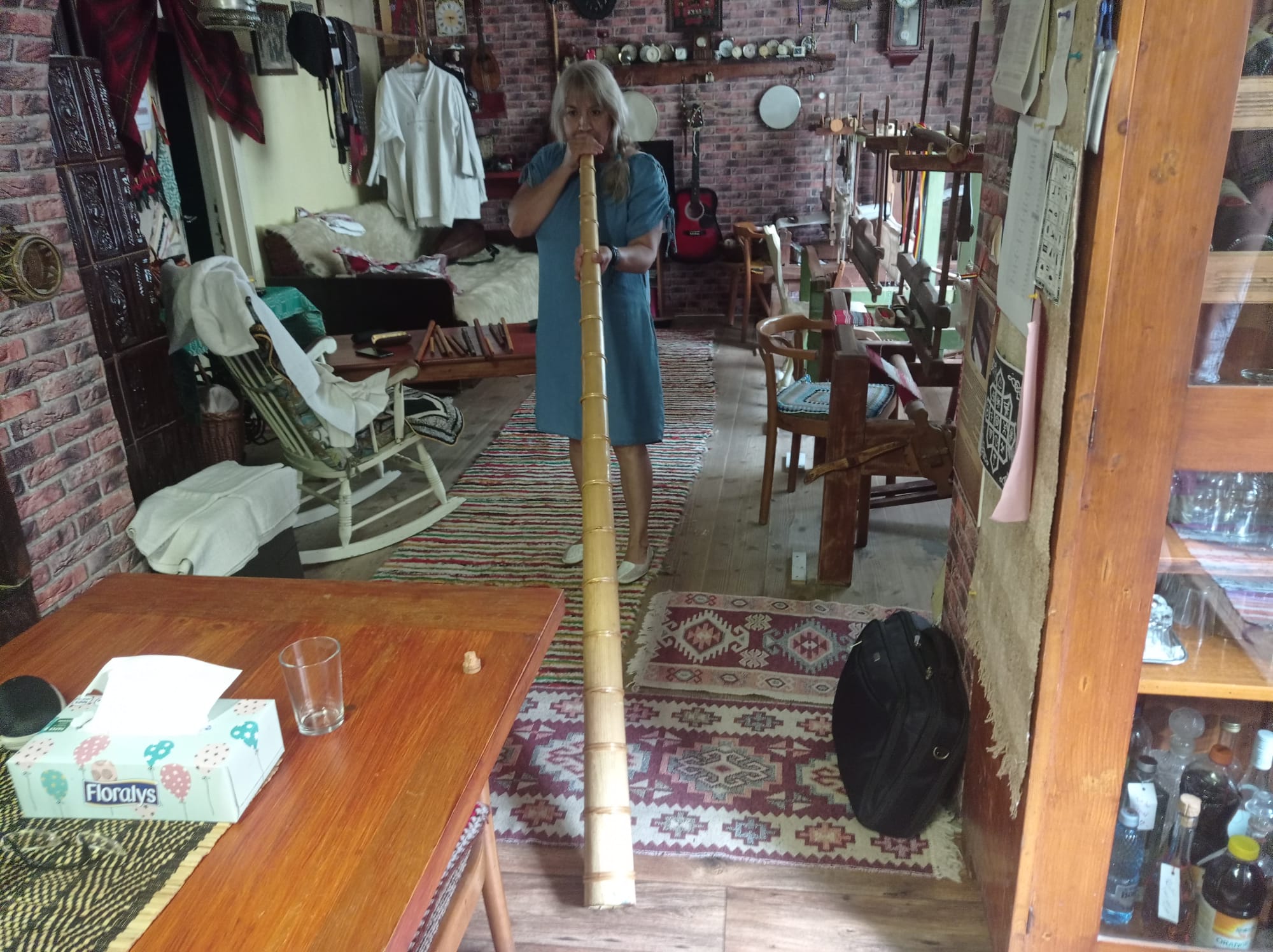 Pe Sorin Petrișor l-am întâlnit pentru prima dată la un festival culinar ținut în vara anului 2022 la Veneția de Jos. Părea unul dintre vechii trubaduri venit din alte timpuri iar muzica pe care o cânta împreună cu soția sa te ducea cu gândul la Barbu Lăutarul, starețul de cobzari lăudat de Franz Liszt. ,,M-am născut în anul 1963 la maternitatea din Victoria, am terminat Liceul Industrial din Victoria, la secția mecanică și mai târziu am făcut Facultatea de drept ,,Simion Bărnuțiu” la Sibiu, prin 2004. Acum lucrez ca paznic la stația de comprimare Transgaz de la Șinca. O perioadă de timp am lucrat la Casa de Cultură din Victoria. Am fost plecat vreo trei ani din țară, în Italia. De acolo a început să mi se miște inima spre locurile natale și a început să-mi încolțească gândul de a aduce traiul arhaic înapoi. În 2003, când m-am întors acasă, am început să cobor lucrurile vechi din pod și să reiterez acest drum spre satul de altă dată, așa cum vedeți acum. Sunt pasionat de istorie, în special de istoria religiilor dar am avut o mare dorință, de când eram mic, să cânt la un instrument tradițional vechi și am început singur, ca autodidact, pentru că pe vremea când eram copil nu am găsit la nimeni niciun sprijin ca să prind îndemânarea de a cânta la un instrument. Între timp am cunoscut un meșter care făurea instrumente de suflat în zona Sf. Gheorghe și am luat de la el fluierele și cele trei cavale. Am exersat un an de zile la indicațiile lui iar pe urmă m-am înscris la niște work-shopuri, un fel de cursuri de una sau două săptămâni, care se fac în anumite perioade ale anului, cu profesori de muzică specializați, cursuri de instrumente arhaice, tradiționale. Acolo am dus și soția, unde a deprins cântatul la cobză, altfel nu ne ridicam și nu cumpăram atâtea instrumente. Eu mai cochetez și cu chitara. Noi suntem fani Grigore Leșe. Între work-shopuri repetăm zilnic la instrumente iar aici se face multă teorie muzicală și practică. Astfel de evenimente au loc la Covasna, Harghita, Mureș, Cluj, Bacău, Buzău. Mai există locuri în care găsești bătrâni ce cântă la instrumente, de unde se poate culege folclor. La Ghimeș se face anual școală de muzică și dans arhaic, unde e tabără internațională pentru că vin și practicanți din Ungaria. Acolo sunt profesori de muzică pentru fiecare instrument- fluier, caval, cobză, cimpoi, vioară și gordună (N.R- un fel de contrabas din lemn, de mărime mai mică, un fel de violă)” a spus Sorin Petrișor. Soția lui Sorin Petrișor, Liliana Opriș, îi este și parteneră la evenimentele culturale la care sunt invitați. A absolvit Ingineria produselor alimentare la Sibiu și a fost secretară la Centrul Școlar pentru Educație Incluzivă Victoria. ,,Cânt la cobză, tilincă, drâmbă și acum învăț să deprind cântatul la tulnic” a spus Liliana.