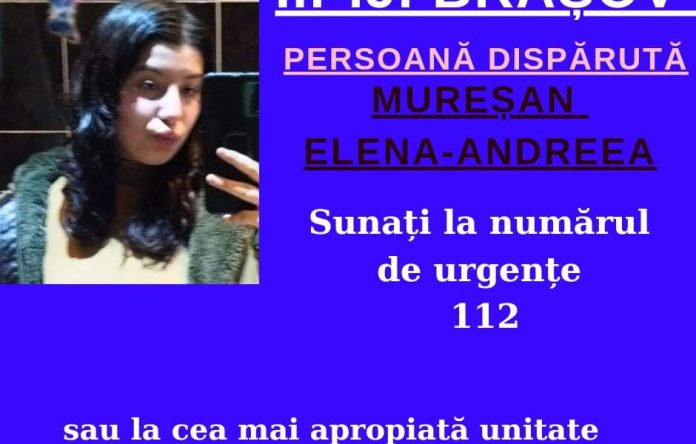 Polițiștii din cadrul Inspectoratului de Poliție Județean Brașov efectuează verificări pentru identificarea unei persoane dispărute, după ce au fost sesizați cu privire la faptul că minora MUREȘAN ELENA-ANDREEA, în vârstă de 14 ani, a plecat voluntar, la data de 2 august a.c., de la domiciliu, din satul Selistat, comuna Șoarș, județul Brașov, fără a se cunoaște destinația și fără a mai reveni până în prezent.