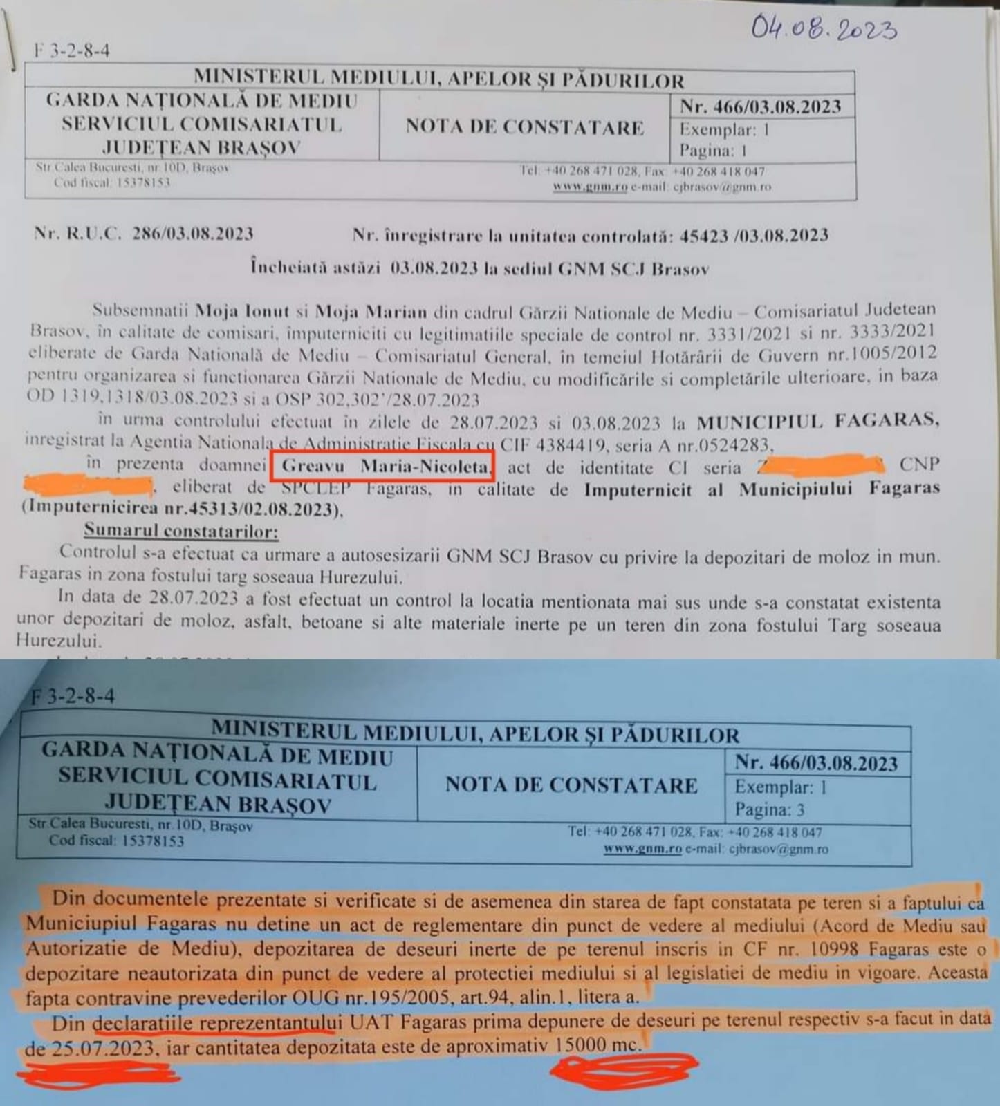 Primăria Făgăraș a fost reprezentată de Greavu Maria Nicoleta, un funcționar public, care a prezentat varianta agreată de primar în această speță. Dar precum edilul așa și funcționarul din subordine! Conform Notei de constatare nr. 466, funcționarul public a susținut că depozitarea a început în 25 iulie 2023 și a fost depozitată cantitatea de 15.000 mc. Este o declarație falsă întrucât depozitarea a început odată cu decopertarea străzilor, la începutul lunii iunie. În privința cantității depozitate, cei 15.000 mc invocați de Greavu Maria ar fi cantitatea depozitată pe zi. Întrucât realitatea din teren contrazice acest funcționar public plătit din banii făgărășenilor, putem spune fără să greșim că afirmațiile prezentate oficial de Greavu Maria în fața Gărzii de Mediu ca punct de vedere al Primăriei Făgăraș sunt mincinoase. Oricum Garda de Mediu, pe lângă amenda dată, (se poate achita în termen de 15 zile jumătate din minimul prevăzut de lege, respectiv 15.000 lei)a impus ,,interzicerea depozitării de deșeuri de orice fel în spații neautorizare pe raza municipiului“ și ,,salubrizarea terenului afectat de deșeuri inerte din Șoseaua Hurezului cu firme autorizate din punct de vedere al protecției mediului“. O obligație similară a fost impusă primarului de către Garda de Mediu și în cazul depozitării deșeurilor provenite din decopertări în Parcul Regina Maria, pe malul râului. Salubrizarea celei zone a însemnat pentru acest primar doar acoperirea gunoaielor cu pământ.