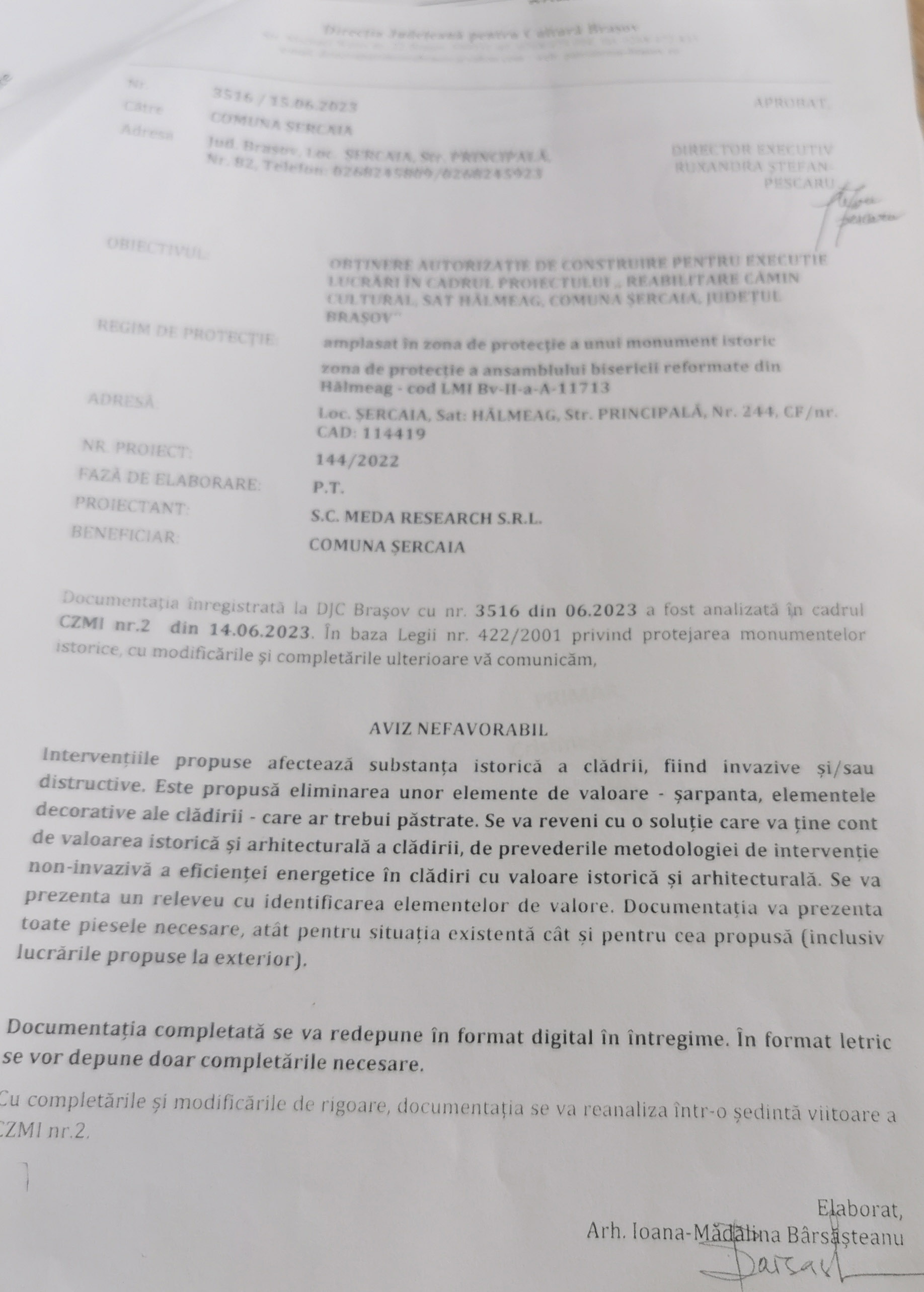 • ,,Intervențiile propuse afectează substanța istorică a clădirii, fiind invazive și/sau distructive. Este propusă eliminarea unor elemente de valoare-șarpanta, elemente decorative ale clădirii-care ar trebui păstrate. Se va reveni cu o soluție care va ține cont de valoarea istorică și arhitecturală a clădirii, de prevederile metodologiei de intervenție non-invazivă a eficienței energetice în clădiri cu valoare istorică și arhitecturală. Se va prezenta un releveu cu identificarea elementelor de valoare. Documentația va prezenta toate piesele necesare, atât pentru situația existentă cât și pentru cea propusă (inclusiv lucrările propuse la exterior)“ este răspunsul DJC Brașov semnat de arh. Ioana Mădălina Bârsășteanu.