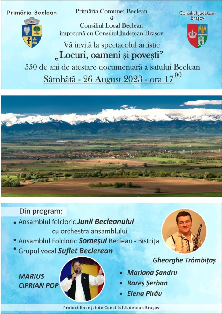 Comunitatea din Beclean va marca vechimea localității printr-un spectacol programat pentru sâmbătă, 26 august a.c., începând cu ora 17.00, la căminul cultural din sat. ,,Locuri, oameni și povești“ a fost denumit proiectul Primăriei și Consiliului Local Beclean, finanțat de CJ Brașov, care va marca istoria localității, o vechime de 550 de ani de la prima atestare documentară. Pe scena căminului cultural vor urca Ansamblul folcloric ,,Junii Becleanului“ cu orchestra proprie, Ansamblul folcloric ,,Someșul“ din Beclean-Bistrița, Grupul vocal ,,Suflet Beclerean“. Vor cânta artiștii de muzică populară Gheorghe Trâmbițaș, Mariana Șandru, Rereș Șerban, Elena Pirău, iar invitat special pr. Marius Ciprian Pop.