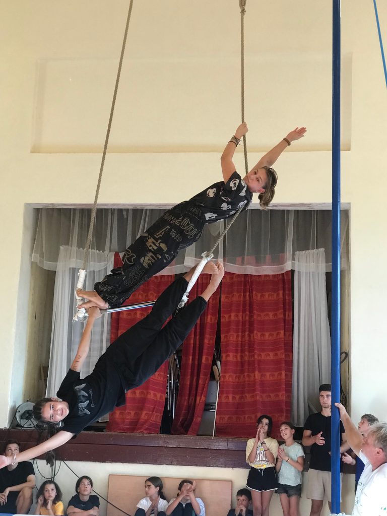 Unii lucrează la eșarfă. Pare ușor, dar să te cațeri pe o bucată de stofă fără să te împotmolești, nu e chiar așa de ușor. La trapez, unii reușesc să se urce din prima, alții mai au nevoie de ajutor și iar alții trebuie întâi să-și învingă frica de înălțime. Între timp în cealaltă parte a sălii este un grup, care încearcă să-și mențină echilibrul pe monociclu. În spectacolele de circ pe care le vedem la televizor, totul pare atât de ușor, dar întrebați-i pe participanții la tabără cât de greu este! Câte căzături, câtă sudoare și câtă perseverență! Dar până la urmă unii au reușit. Afară în curte, în fața vechii biserici-cetate din Bărcut, la umbra unui copac, sunt jonglerii. Cutii cu tot felul de obiecte le stau la dispoziție – mingi, eșarfe, măciuci, inele, poi, diabolo, flowerstick etc. Fiecare își alege câte ceva și începe ușor – aruncă o minge dintr-o mână în alta, apoi încearcă cu două, cei mai experimentați știu să jongleze deja cu trei mingi. Dar ce-ar fi să încerce cu patru? Sau să învețe noi trucuri cu diabolo? Și aici e nevoie de maximă concentrare și de multă, multă muncă. Mingile nu stau în aer de la sine, trebuie, totuși, învinse forțele gravitației. Of, iar a căzut! O luăm de la capăt: un – doi – trei – patru … și încă odată.