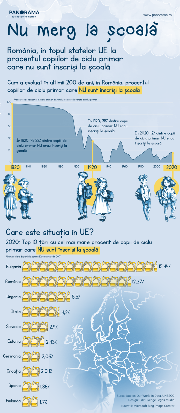 12% dintre copiii români care au vârsta la care cei mai mulți merg la școală nu figurau pe lista de înscrieri a școlilor. Doar Bulgaria stă mai rău ca noi, cu un procent și mai mare, de 15%. De altfel, România și Bulgaria sunt singurele state din UE care înregistrează rate de peste 10% la acest capitol.