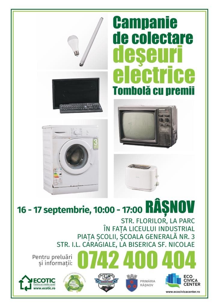 Agenția de Dezvoltare Intercomunitară ISO Mediu, în parteneriat cu Ecotic, cu EcoCivica și Primăria Râșnov, vor derula o nouă campanie de colectare a deșeurilor electrice și electronice în oraș. Acțiunea este programată pentru zilele de 16 și 17 septembrie,ora 17.00. Vor fi amenajate puncte de colectare în patru zone din oraș: