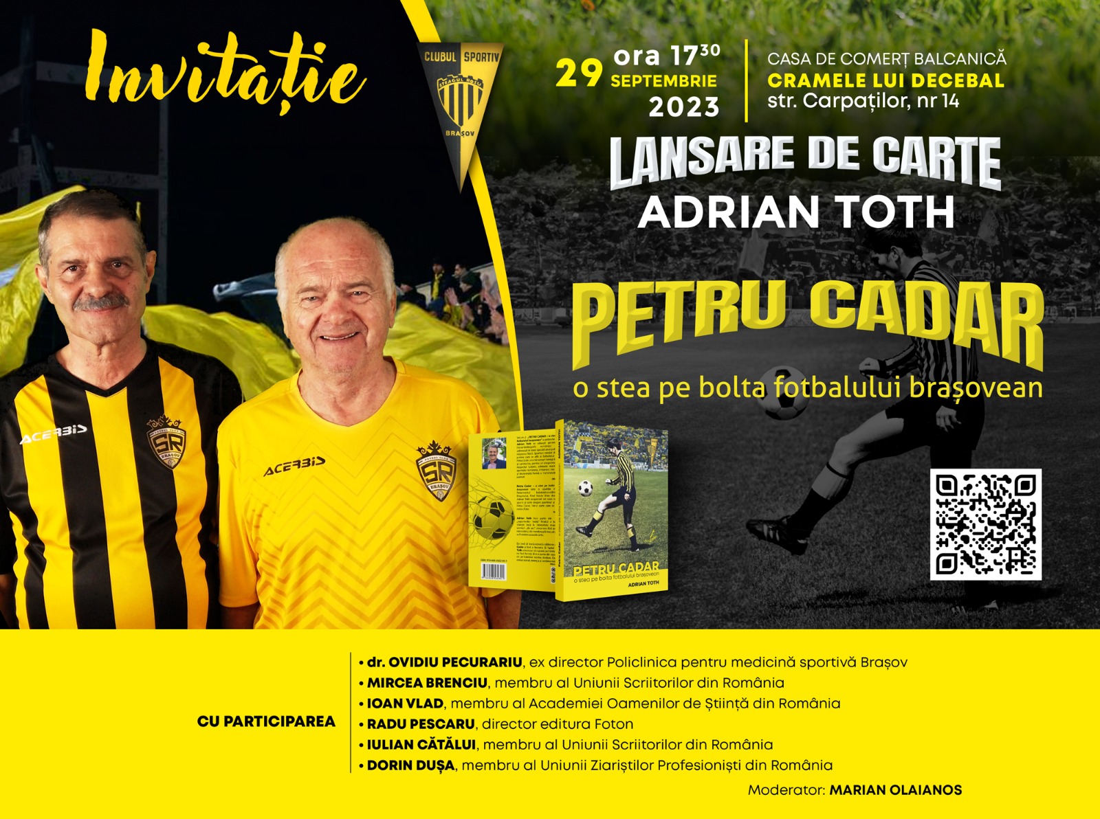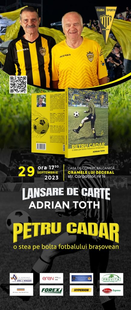Lansarea volumului ,,Petru Cadar, o stea pe bolta fotbalului brașovean“ de Adrian Toth va avea loc în 29 septembrie a.c., începând cu ora 17.30, la Cramele lui Decebal de la Casa de Comerț Balcanică din Brașov, strada Carpaților, nr. 14. La acest eveniment moderat de cunoscutul cronicar sportiv Marian Olaianos vor participa și vor avea prezentări: dr. Ovidiu Pecurariu, ex director Policlinica pentru medicină sportivă Brașov, Mircea Brenciu, membru al Uniunii Scriitorilor din România, Ioan Vlad, membru al Academiei Oamenilor de Știință din România, Radu Pescaru, director editura Foton, Iulian Cătălui, membru al Uniunii Scriitorilor din România și Dorin Dușa, membru al Uniunii Ziariștilor Profesioniști din România. La eveniment vor participa foștii colegi ai lui Petru Cadar, precum și alți fosti fotbaliști de frunte ai Brașovului.