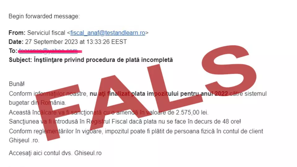 Potrivit ANAF, mesajele, care au vin de la adresa „Serviciul fiscal: fiscal_anaf@testandlearn.ro”, atrag atenția contribuabililor că „vor fi sancționați cu amenda de 2.575 lei, dacă nu efectuează plata în decurs de 48 de ore!”, pentru o așa-zisă plată nefinalizată a impozitului pentru anul precedent. Conducerea ANAF a subliniat că „solicitarea frauduloasă a fost transmisă de pe o adresă de e-mail care nu aparține instituției, iar documentul conține exprimări nespecifice comunicărilor ANAF”.