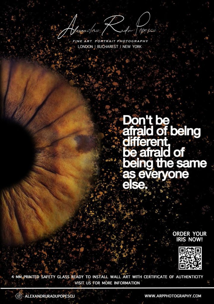 Al.R.P.: Nu știu ce spune irisul despre un om, dar am căutat explicații de la medici specialiști, ei pot spune despre iris. Eu mă limitez doar la culoare și textură, acestea mă fascinează. Am până acum vreo 300 de irisuri fotografiate, o adevărată colecție, dar fiecare iris înseamnă muncă. O poză editată îmi ia cam o zi, nu pot face mai mult de o poză pe zi. Sunt de la 4 la 8 ore de muncă, depinde de lumina în care am fotografiat, apoi fac retușuri, însă la iris nu fac nimic, doar o reflecție, nu o alterez, o vreau cât mai pură.