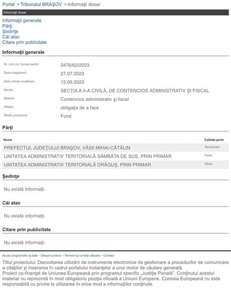 După trei ani în care i-au fost puse piedici comunei Sâmbăta de Sus pentru a putea recupera terenurile luate abuziv, pe rolul Tribunalul Brașov a fost înregistrat Dosarul nr. 3476/62/2023 la data de 27 iulie privind ,,obligația de a face“. Părțile în acest dosar sunt Prefectul Județului Brașov, reclamant, iar UAT Drăguș și UAT Sâmbăta de Sus, pârâți.