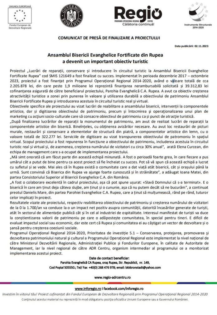 Proiectul „Lucrări de reparații, conservare și introducere în circuitul turistic la Ansamblul Bisericii Evanghelice Fortificate Rupea” cod SMIS 121649 a fost finalizat cu succes. Implementat în perioada decembrie 2017 – octombrie 2023, proiectul a fost finanțat prin Programul Operațional Regional 2014-2020, având o valoare totală de cca 2.205.878 lei, din care peste 1,9 milioane lei reprezintă finanțarea nerambursabilă solicitată și 39.312,83 lei cofinanțarea asigurată de către beneficiarul proiectului, Parohia Evanghelică C.A. Rupea. A avut ca obiectiv creșterea atractivităţii turistice a zonei prin punerea în valoare şi utilizarea durabilă a obiectivului de patrimoniu Ansamblul Bisericii Fortificate Rupea şi introducerea acestuia în circuitul turistic real şi virtual.