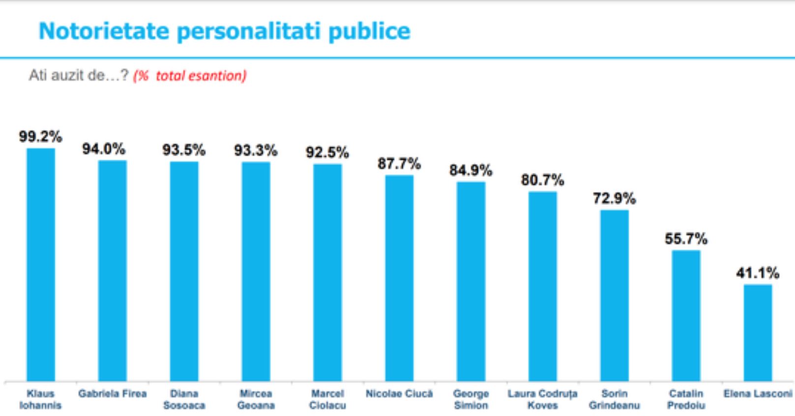 The head of state is followed by Gabriela Firea with a notoriety of 94%, Diana Şoşoacă with 93.5%, Mircea Geoană with 93.3% and Marcel Ciolacu with 92.5%.