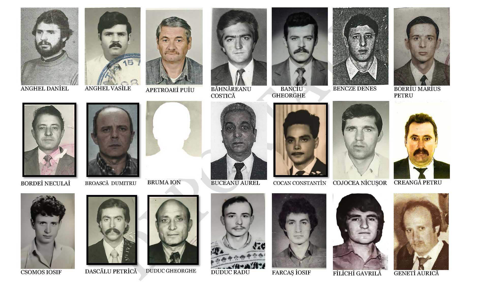 - 3 decembrie 1987 – Sentinţa penală nr. 2823 – cei 61 de inculpaţi primesc condamnări între 6 luni şi 3 ani închisoare, pedepsele urmând a fi executate prin muncă corecţională. Pedepsele au însumat 91 de ani şi jumătate. Doi dintre inculpaţi au mai primit încă 1 an de închisoare pentru încercarea de fugă în Iugoslavia, 26 au fost condamnaţi la executarea prin muncă corecţională. Ceilalţi au fost condamnaţi la 2 ani cu suspendare, însă şi ei au fost transferaţi fiecare la alt loc de muncă în oraşe cât mai îndepărtate, la Topliţa, Paşcani, Huşi, Piatra Neamţ, Râmnicu Vâlcea, Buzău, Câmpu Lung, Craiova, Botoşani, Vaslui, Focşani, Moreni, Suceava, Bacău, Târgu Neamţ, Galaţi, Zalău, Brăila, rădăuţi, Medgidia, Tulcea, Dorohoi, Târgovişte. . Pedepsele voiau să arate umanismul, clemenţa şi bunăvoinţa dictatorului. Abia după 1989 cei condamnaţi s-au putut întoarce acasă.