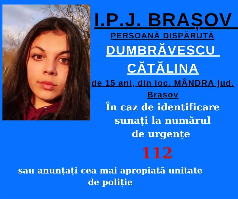 Dumbrăvescu Cătălina, o copilă în vârstă de 15 de ani, a plecat de la domiciliul din satul Șona, comuna Mândra, fără a mai reveni până în prezent. După ce au primit o sesizare, polițiștii efectuează cercetări pentru a identifica fata dispărută.