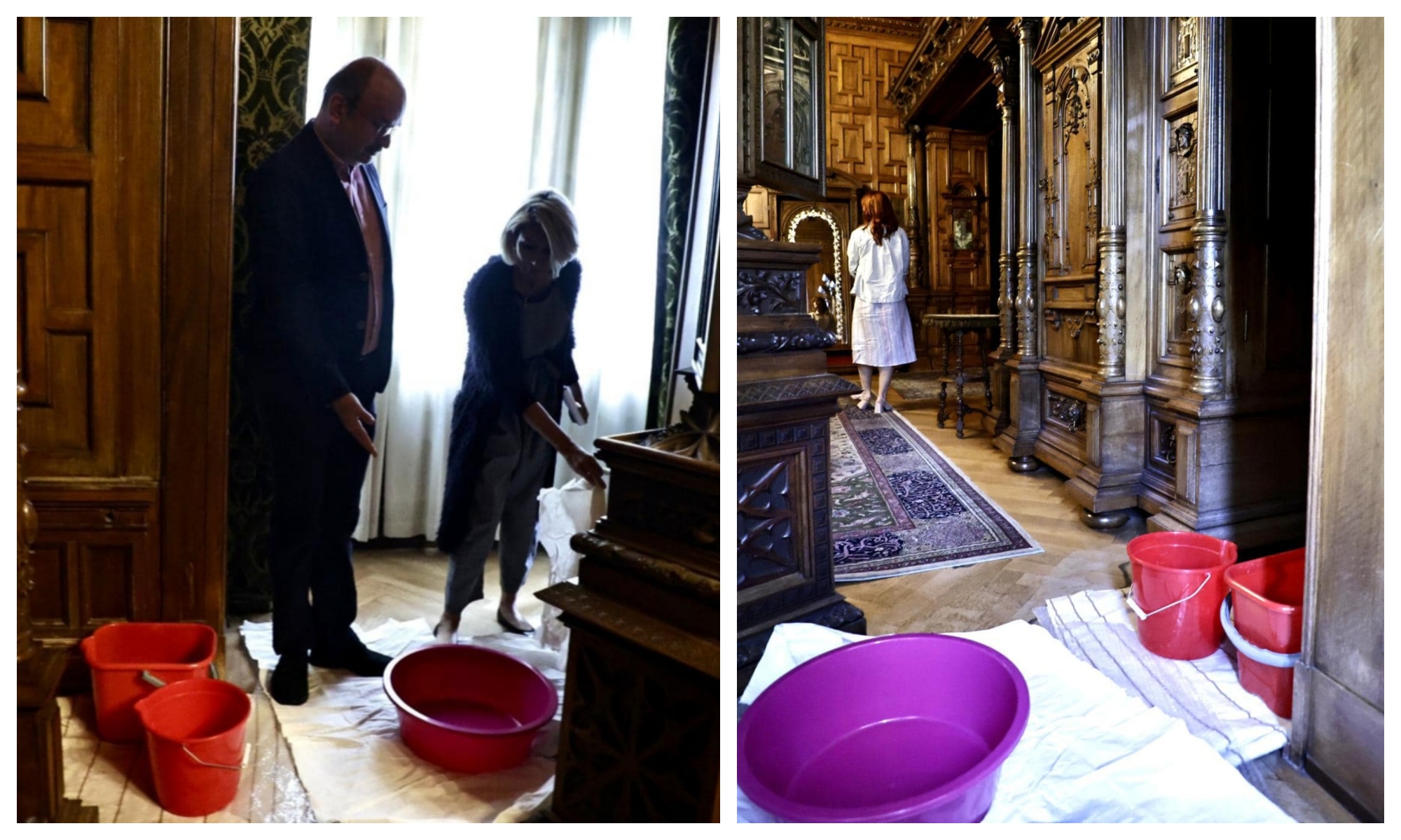 Plouă în Castelul Peleș de la Sinaia, angajații fiind nevoiți să folosească tot felul de improvizații pentru a proteja exponatele extrem de valoroase din muzeu, titrează brasov.net.