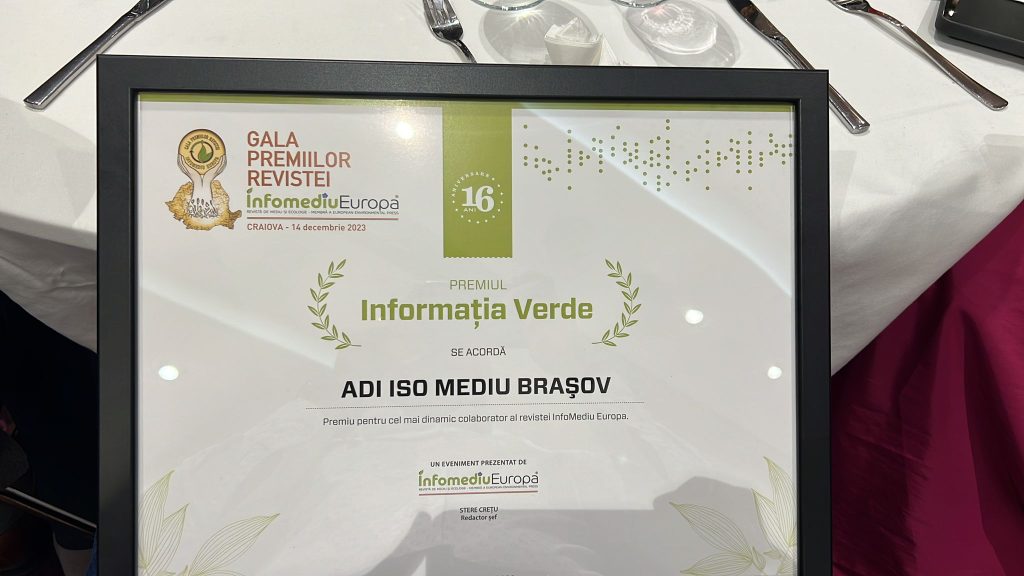 Ediția XVI-a a Galei Premiilor Revistei InfoMediu Europa săa desfășurat la Craiova în 14 decembrie 2023 și a reunit companiile româneşti implicate în domeniul protecţiei mediului, nume de referinţă din mediul de afaceri, sectorul administraţiei publice, sectorul financiar-bancar, mediul politic, precum şi organizaţiile non-guvernamentale. Anul acesta au fost fi decernate 7 premii, iar unul dintre ele a fost obținut de Asociația de Dezvoltare Intercomunitară „ISO Mediu” Brașov (ADI ISO Mediu Brașov). Mai exact, asociația brașoveană a primit „Premiul Informaţia Verde”, distincție acordată pentru cel mai dinamic colaborator al revistei InfoMediu Europa.