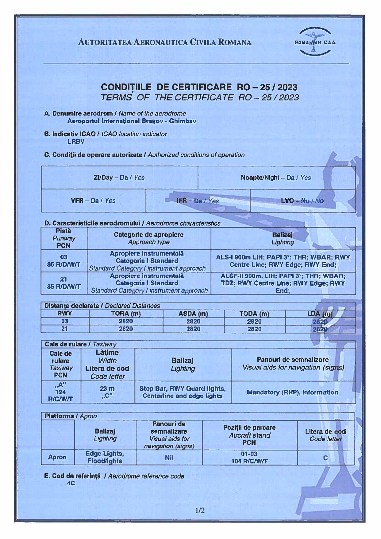 Începând de luni, 15 ianuarie 2024, Aeroportul Internaţional Braşov-Ghimbav va avea un program de funcționare de 16 ore. Ca urmare a solicitării privind extinderea programului de operare, formulată de Regia Autonomă „Aeroportul Internaţional Braşov-Ghimbav” în 27 septembrie 2023, cu completările ulterioare transmise în intervalul octombrie 2023 – ianuarie 2024, conducerea Autorităţii Aeronautice Civile Române (AACR) a aprobat schimbarea propusă şi a emis în data de 11 ianuarie 2024 Condiţiile de Certificare pentru Aeroportul Internaţional Braşov-Ghimbav RO – 25/2023 Ediţia 2.Astfel, aeronavele planificate vor putea ateriza sau decola de pe Aeroportul Brașov în intervalul orar 07:00-23:00.Amintim că decizia de prelungire a orarului AIBG a fost convenită încă din 30 octombrie 2023, de oficialii Consiliului Judeţean Braşov, cei ai Aeroportului Internaţional Braşov-Ghimbav şi conducătorii instituţiilor care reglementează domeniul aeronautic în ţara noastră – Administraţia Română a Serviciilor de Trafic Aerian ROMATSA RA şi Autoritatea Aeronautică Civilă Română.