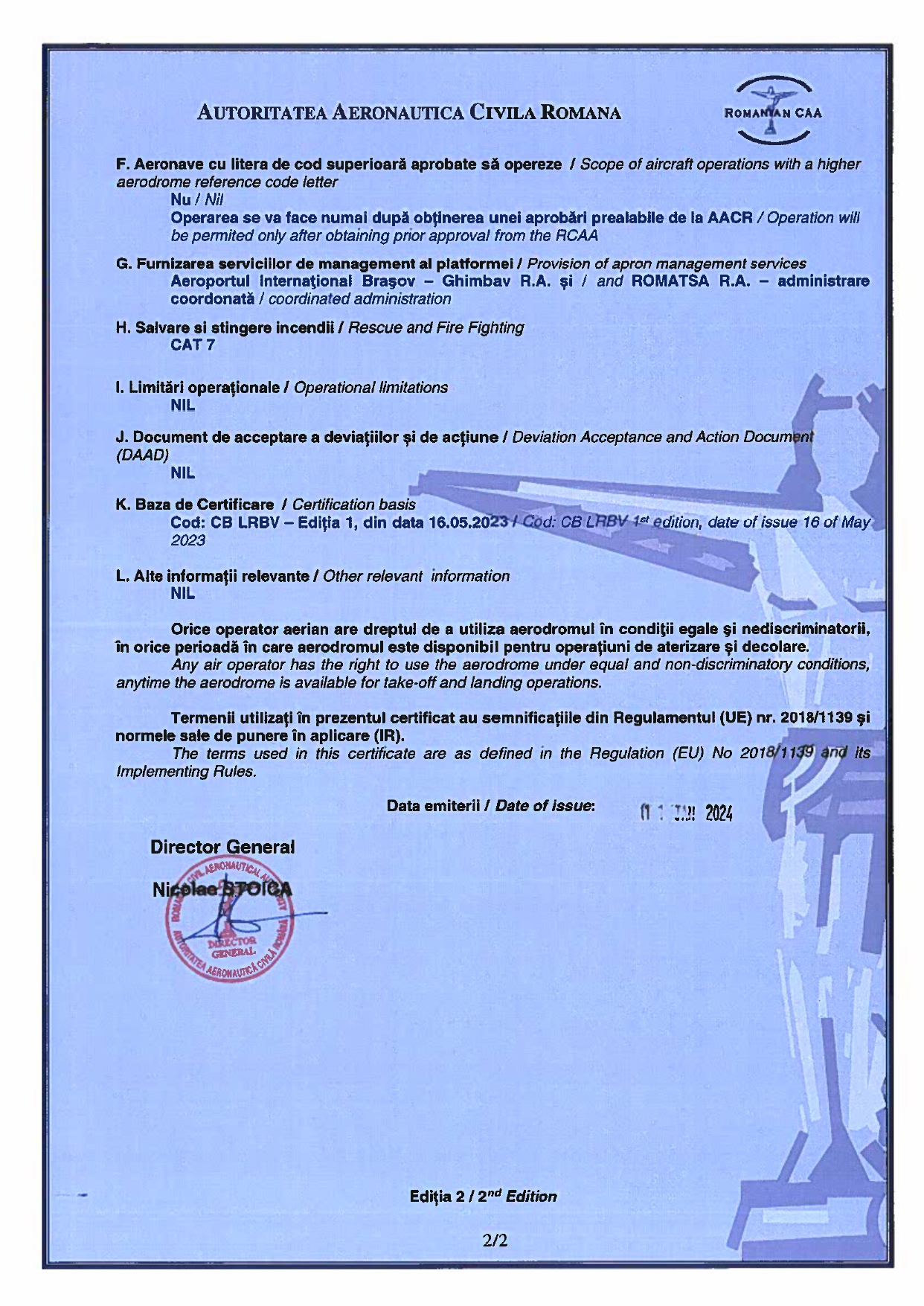 - „După adresa din 29 noiembrie 2023 prin care ROMATSA şi-a reconfirmat acordul privind extinderea programului Aeroportului Internaţional Braşov-Ghimbav de la 12 la 16 ore, am primit şi documentul Autorităţii Aeronautice, semnat de domnul director general Nicolae Stoica, în baza căruia din 15 ianuarie 2024 avem aprobarea pentru orarul prelungit. Împreună cu domnul director Constantin Albu, în parteneriat cu Consiliul de Administraţie al AIBG, cu sprijinul instituţiilor publice din cadrul aeroportului şi cu suportul permanent asigurat de ROMATSA şi AACR am făcut toate demersurile premergătoare acestui moment mult aşteptat atât de noi, ca administratori ai obiectivului, cât mai ales de companiile aeriene interesate de Aeroportul Braşov şi cu toţii suntem mulţumiţi că am reuşit să facem acest prim pas spre un program de 24 de ore din 24”, a declarat preşedintele Consiliului Judeţean Braşov, Todorică-Constantin Şerban.
