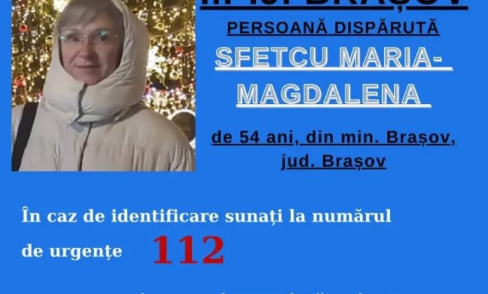 „Polițiștii din cadrul Inspectoratului de Poliție Județean Brașov efectuează verificări pentru identificarea unei persoane dispărute, după ce au fost sesizați cu privire la faptul că SFETCU MARIA-MAGDALENA, în vârstă de 54 de ani, ar fi plecat voluntar de la domiciliul, din municipiul Brașov, fără a se cunoaște destinația și fără a mai reveni până în prezent“ a transmis purtătorul de cuvânt al Inspectoratului de Poliție Județean Brașov, agent șef principal Daniel Zontea.