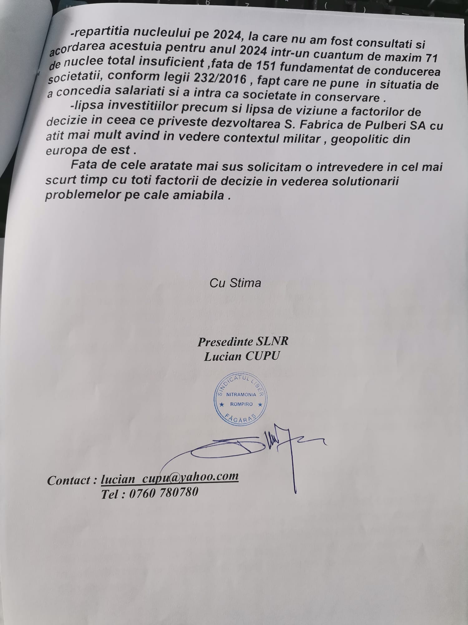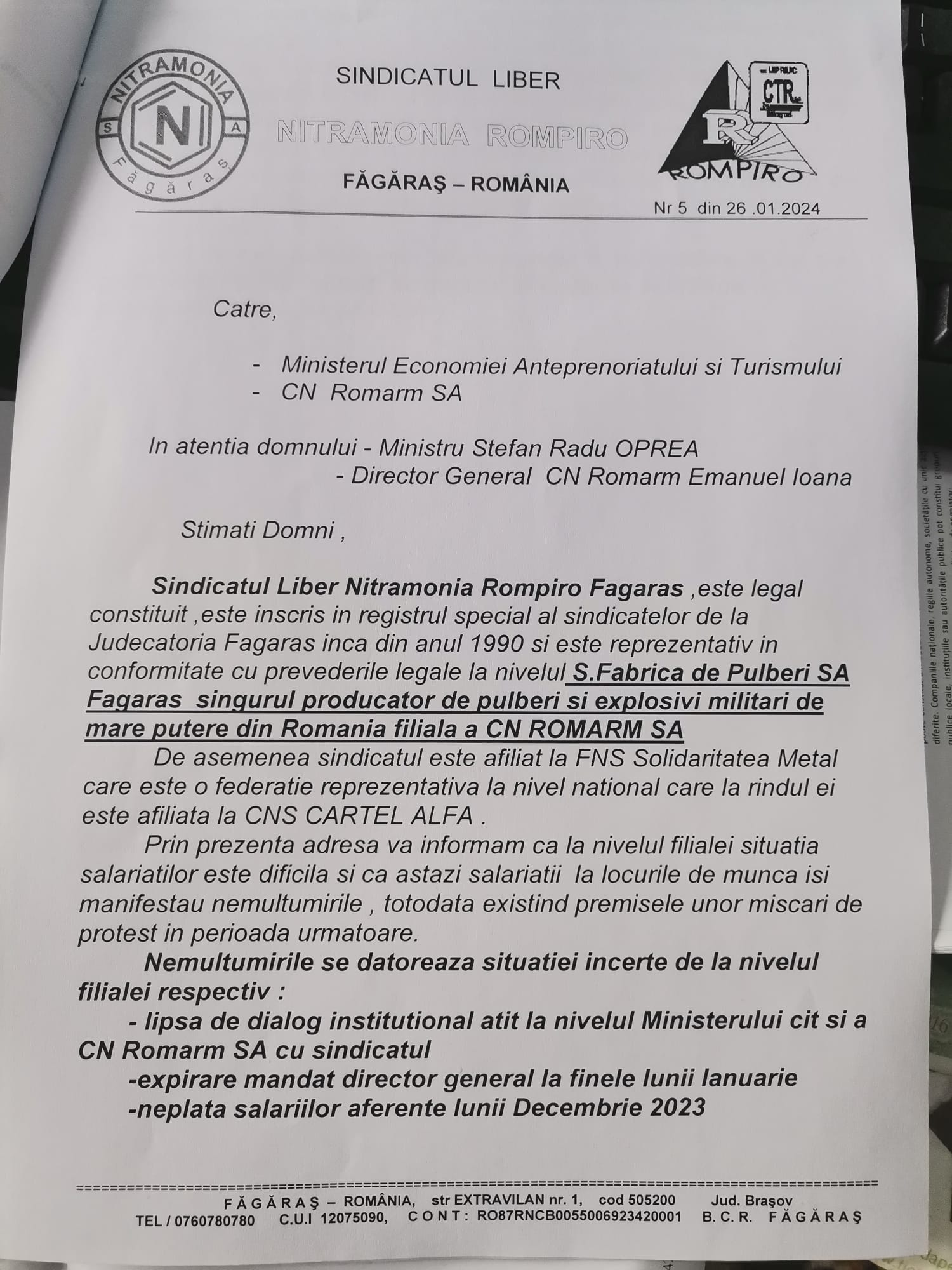 - Lipsa de dialog instituțional atât la nivelul Ministerului cât și a CN Romarm SA cu partenerul social respectiv Sindicatul Liber Nitramonia Rompiro Făgăraș