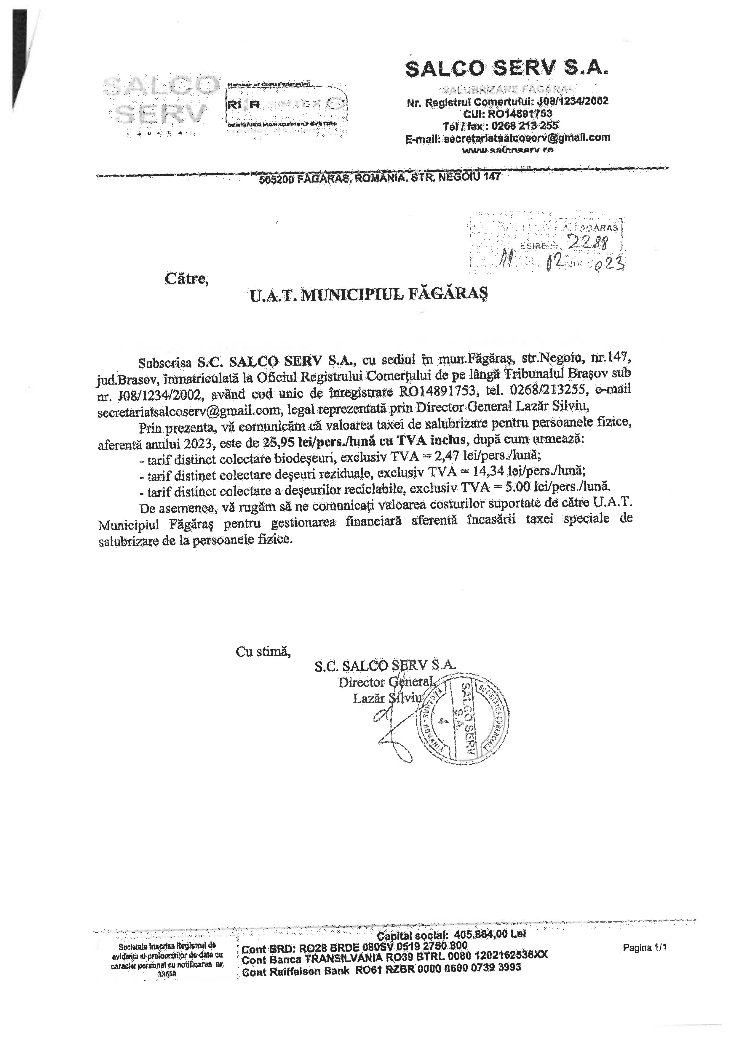 Document. Taxa de salubritate se majorează, la Făgăraș. Salco vrea 25,95 lei/persoană/lună, iar proiectul HCL stipulează 20 lei, plus cota de dezvoltare