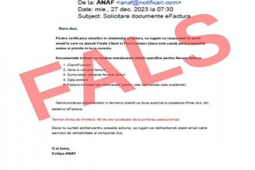 „Atenționăm asupra unei noi campanii de mesaje false, transmise în numele ANAF, prin care contribuabilii sunt rugați să furnizeze informații privind facturile emise în sistemul e-Factura pentru societățile pe care le administrează sau la care lucrează.