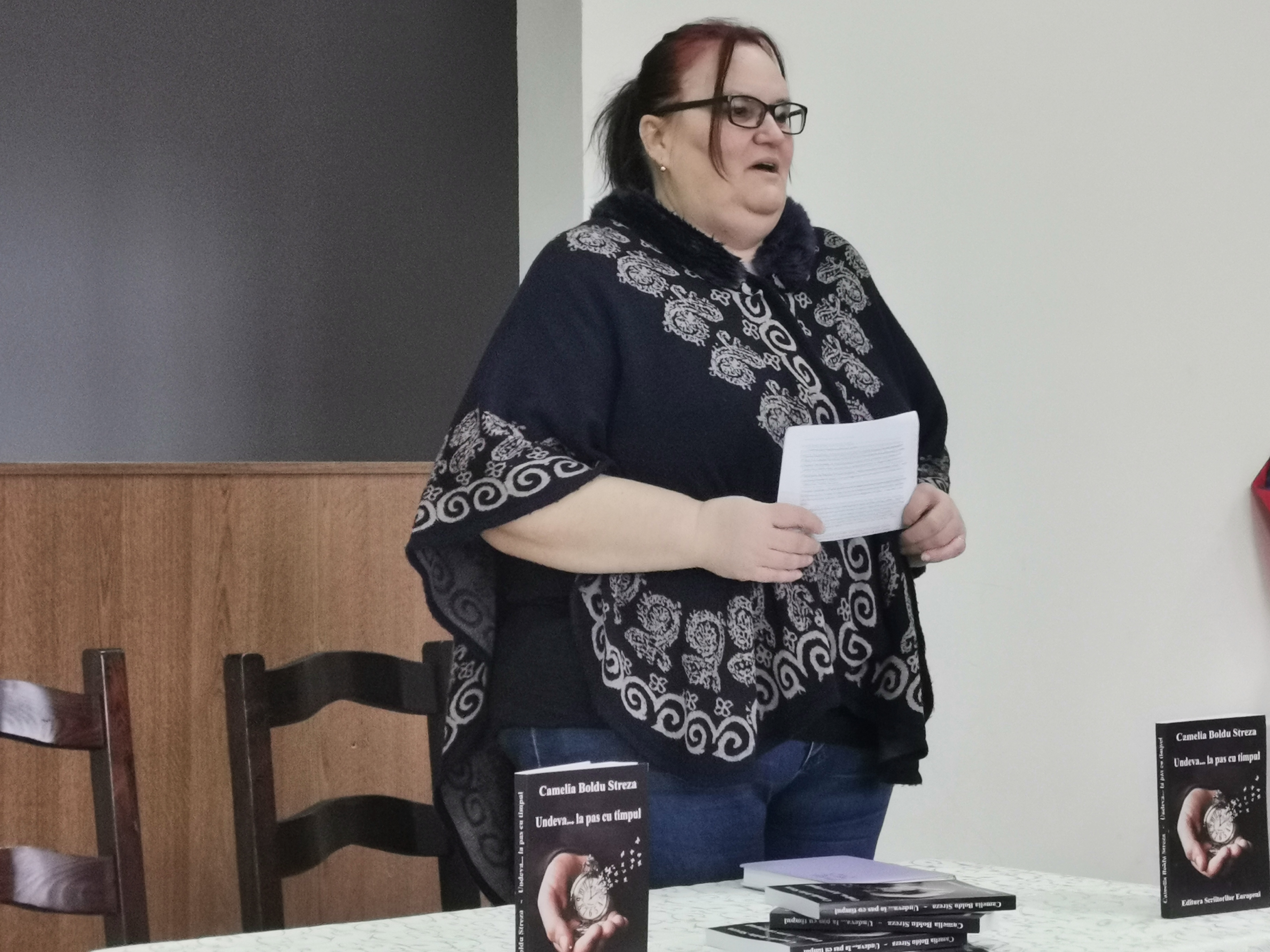 Aceasta era invitația de a participa la lansarea volumului ,,Undeva…la pas cu Timpul“. Nu aveai cum să nu participi la evenimenul organizat de Camelia Boldu Streza, inginerul chimist de la Victoria, care a surprins publicul printr-un nou volum de versuri. La Biblioteca de la Casa de Cultură din Victoria, într-o atmosferă plăcută, intimă, s-a vorbit despre poezie, despre rimă, despre iubire și despre rostul nostru văruit parcă în tonuri de albastru și alb. Publicul a fost întâmpinat cu versurile autoarei recitate de Alina Arbajter, o localnică stabilită în Germania.