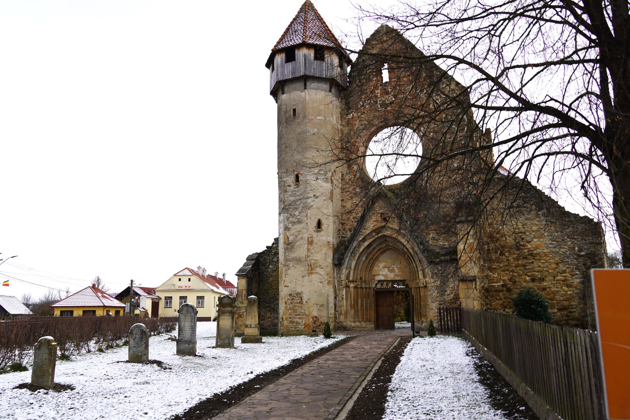 În ciuda trecerii timpului și a distrugerilor suferite, monumentul şi-a păstrat arhitectura impunătoare. Fațada vestică a bisericii fostei mănăstiri are o fereastră polilobată, o rozetă, tipică pentru construcţiile cisterciene. În interiorul ruinelor mănăstirii se află cimitirul de soldaţi germani căzuţi la Porumbacu, în septembrie 1916. Mormintele au fost mutate în 1928 aici pentru a fi protejate. În curtea bisericii, în același an, zidarul Rudolf Binder a ridicat în onoarea celor căzuți statuia lui Roland, erou germanic din secolul al VIII-lea, simbol al libertăţii şi dreptăţii căzut în război cu necredincioşii. Exteriorul bisericii evanghelice este decorat cu ferestre şi rozete tipice stilului gotic. Ruinele bibliotecii (‘reflectorium’) şi a dormitoarelor dezvăluie îmbinarea dintre stilul romanic, prin coloanele încadrate de arcade în semicerc, cu gotic, tipic fiind arcul frânt. În interiorul bisericii se vede altarul baroc cu Sfinții Petru și Pavel la icoana crucificării și orga barocă, veche din 1777. Biserica a fost renovată în 2013 prin fonduri europene.
