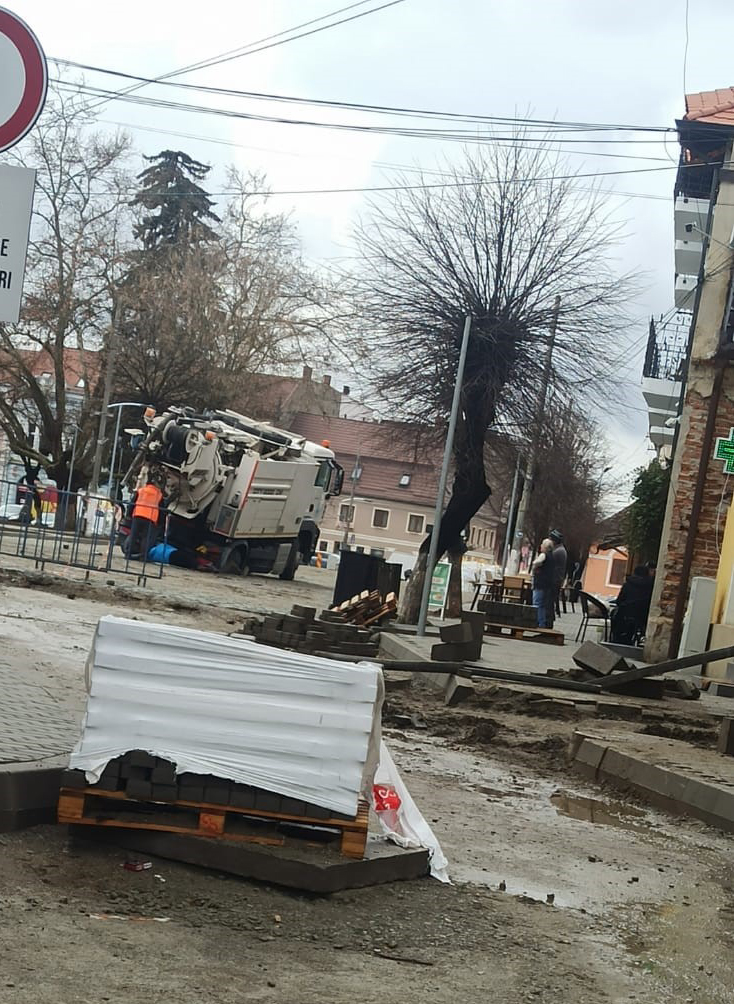 Vidanja, acel utilaj care curăță haznalele, s-a adâncit în pavajul nou realizat din centrul Făgărașului, la propriu. Dalele și pavele cu stratul de nisip, așa cum au fost montate de firmele alese pe ,,sprânceană“ de primar și ,,specialiștii“ lui de la Achiziții din Primăria Făgăraș, au fost dislocate și distruse sub greutatea utilajului. Vineri, 15 martie a.c., s-a întâmpat incidentul, care afectează proiectul de mobilitate din zona centrală a urbei. Acesta dovedește încă odată că lucrările aferente proiectului de mobilitate urbană au fost executate de mântuială, însă pe bani grei. Peste 45 milioane de lei este valoarea proiectului din zona centrală, un proiect finanțat din fonduri europene, care se va finaliza însă din banii făgărășenilor. Și asta pentru că edilul local a întârziat implementarea proiectului și a pierdut finanțarea.