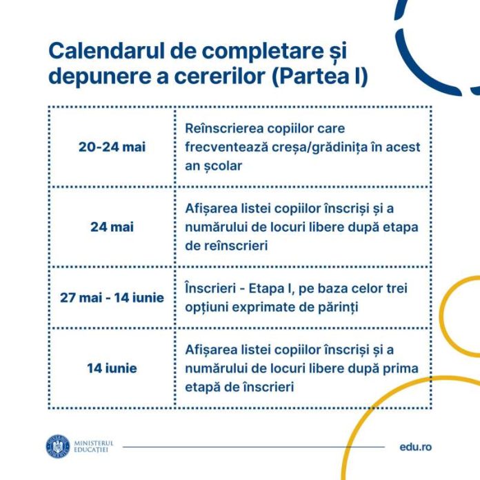 Prima etapă de înscriere pe baza celor trei opţiuni exprimate de părinţi este cuprinsă între 27 mai şi 14 iunie.