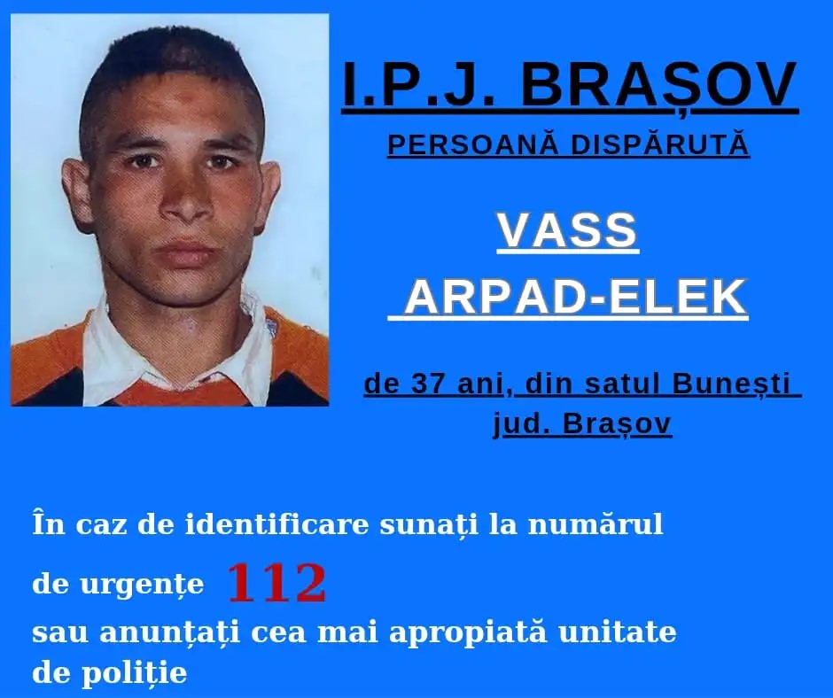 Polițiștii brașoveni efectuează verificări pentru identificarea unei persoane dispărute, după ce au fost sesizați cu privire la faptul că VASS ARPAD ELEK, în vârstă de 37 de ani, ar fi plecat voluntar de la domiciliul, din satul Bunești, județul Brașov, fără a se cunoaște destinația și fără a mai reveni până în prezent.