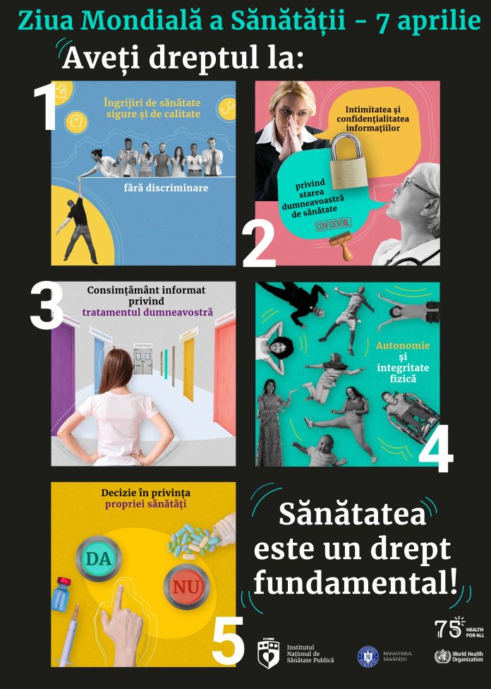 Ziua Mondială a Sănătăţii este sărbătorită încă din anul 1950, iar în acest an are ca temă „Sănătatea mea, dreptul meu”. Sănătatea este un drept fundamental al omului, recunoscut în Constituția Organizaţiei Mondiale a Sănătăţii (1948), Declarația Universală a Drepturilor Omului (1948) și în alte tratate internaționale și regionale privind drepturile omului. În România, dreptul la ocrotirea sănătății este prevăzut în Art. 34 – Dreptul la ocrotirea sănătății, din Constituția României.