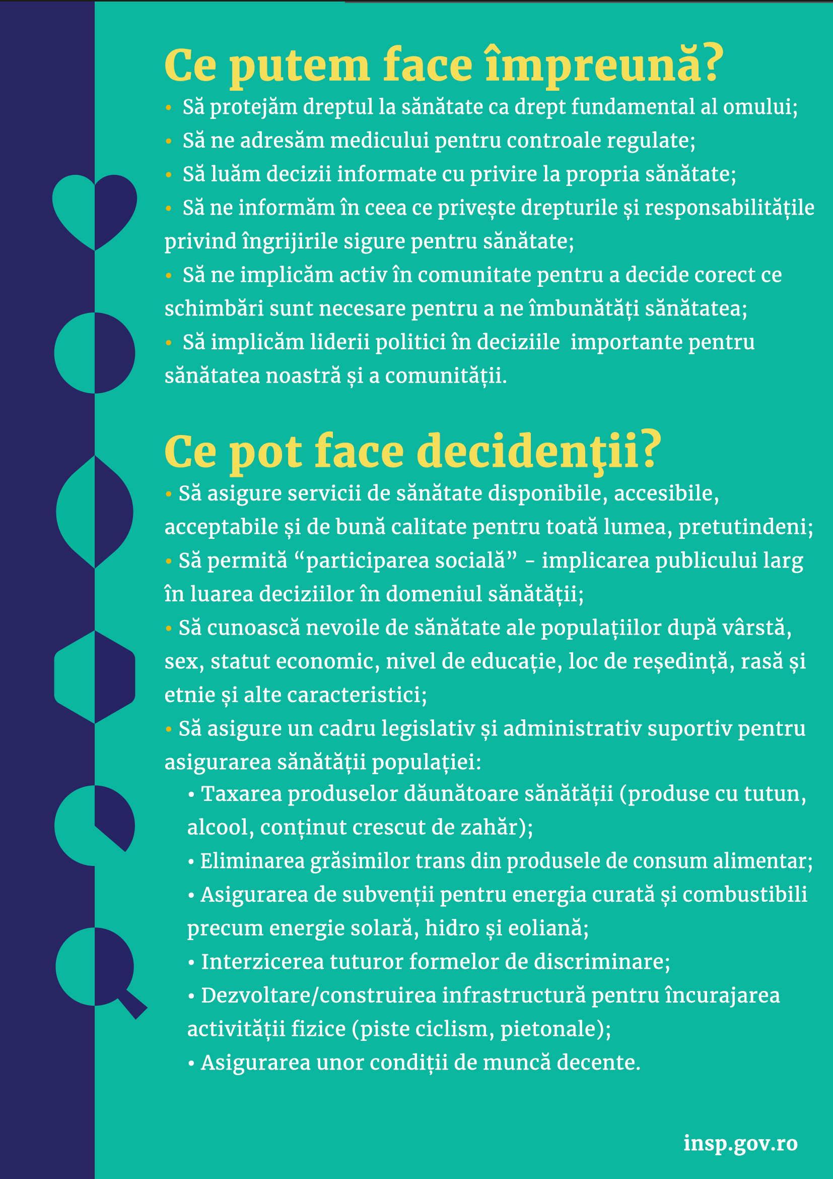 - să ne implicăm activ în comunitate pentru a decide corect ce schimbări sunt necesare pentru a ne îmbunătăți sănătatea;