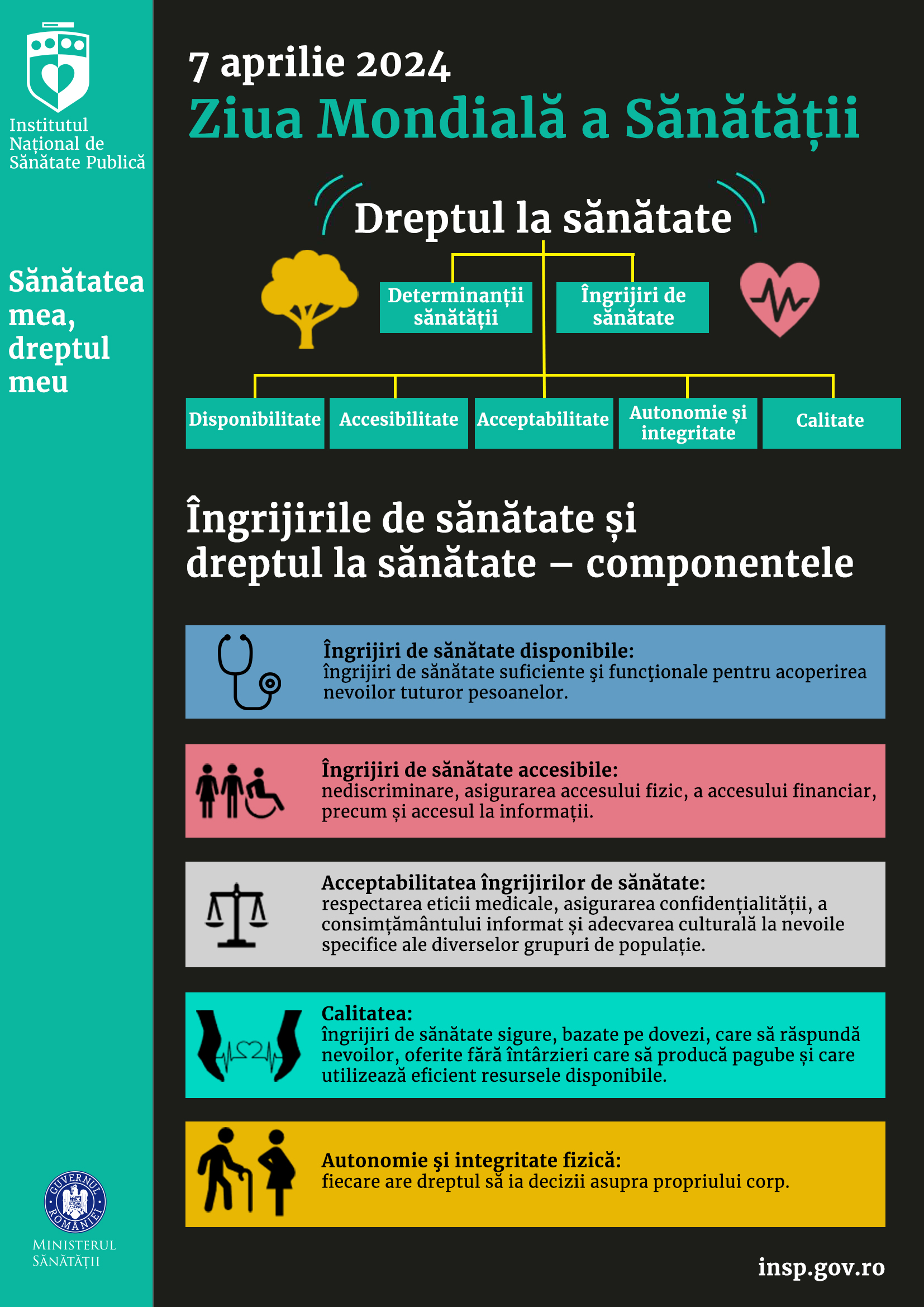 Ziua Mondială a Sănătăţii este sărbătorită încă din anul 1950, iar în acest an are ca temă „Sănătatea mea, dreptul meu”. Sănătatea este un drept fundamental al omului, recunoscut în Constituția Organizaţiei Mondiale a Sănătăţii (1948), Declarația Universală a Drepturilor Omului (1948) și în alte tratate internaționale și regionale privind drepturile omului. În România, dreptul la ocrotirea sănătății este prevăzut în Art. 34 – Dreptul la ocrotirea sănătății, din Constituția României.