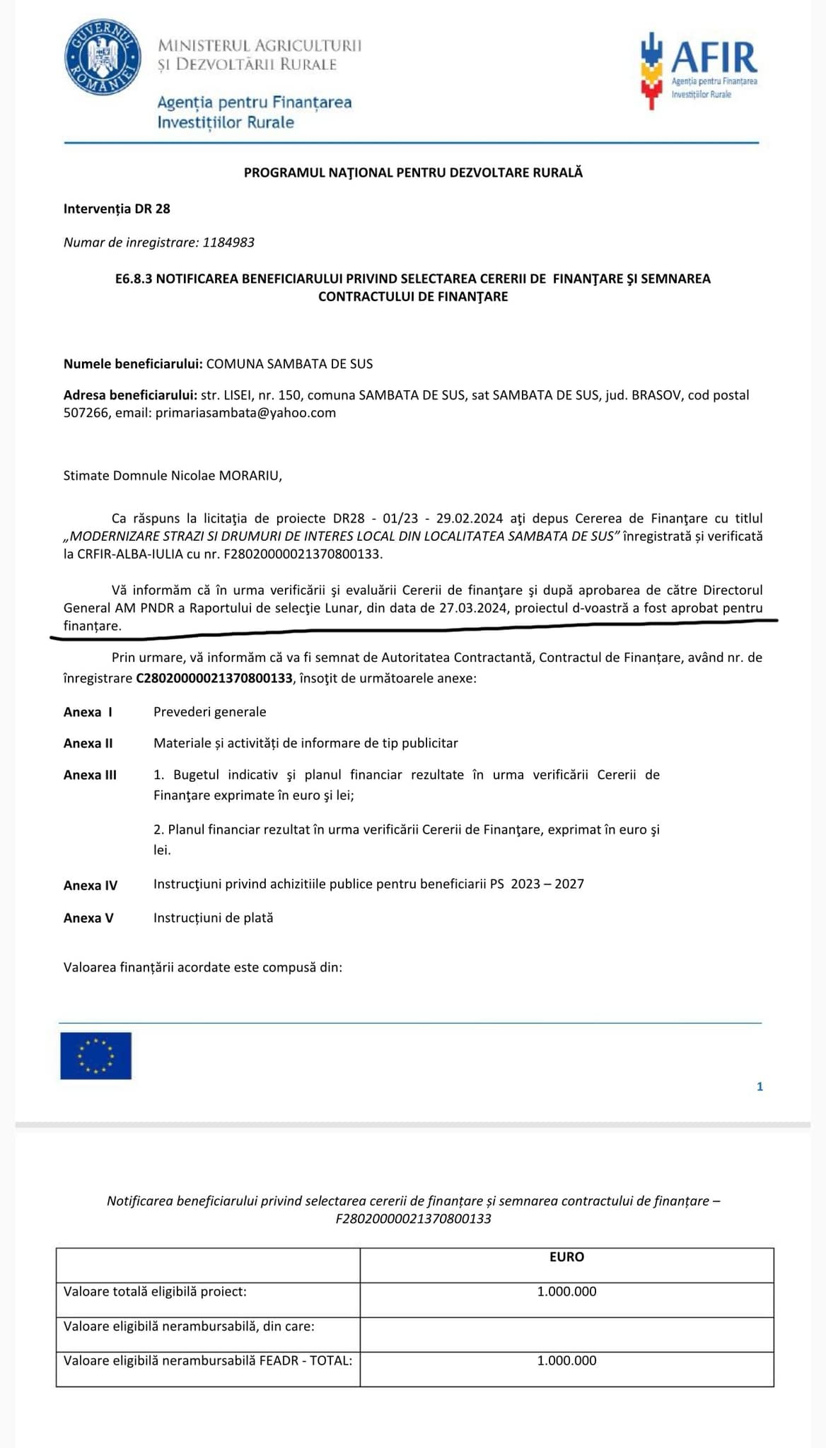 Un proiect în valoare de un milion de euro a fost aprobat pentru finanțare de AFIR pentru comuna Sâmbăta de Sus, fonduri nerambursabile. Este vorba despre proiectul ,,Modernizare străzi și drumuri de interes local din localitatea Sâmbăta de Sus“ care a fost depus la AFIR, iar în urma verificării și evaluării a fost aprobat. Astfel cinci străzi din localitate vor fi modernizate.