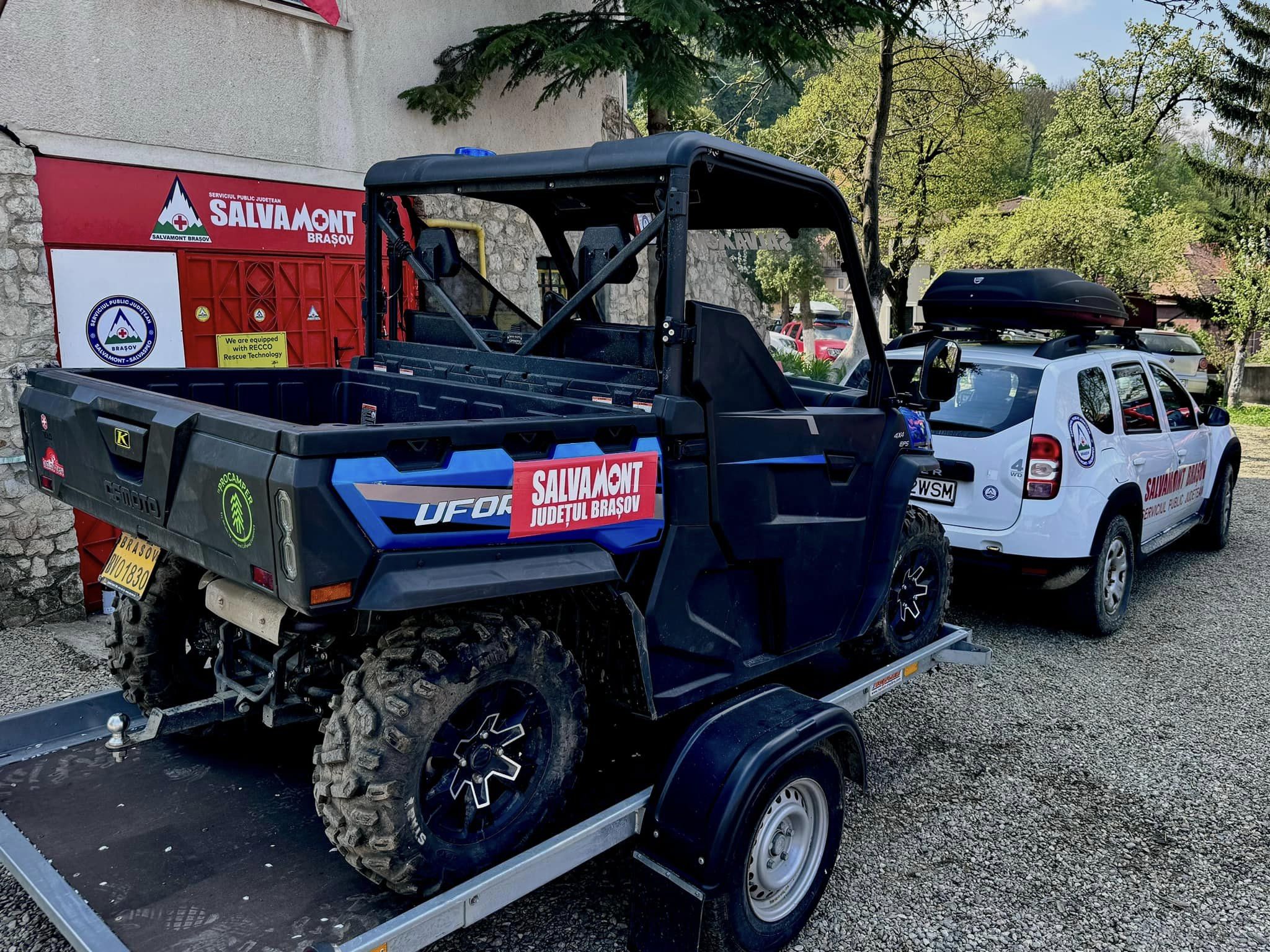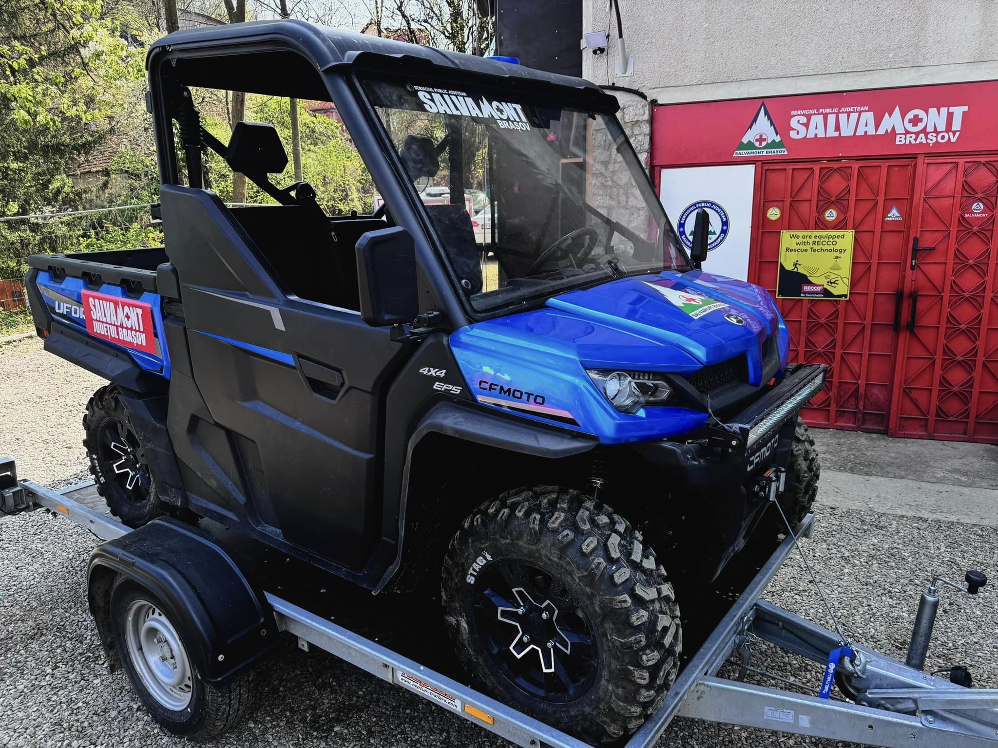 Formația Salvamont Victoria, din cadrul Serviciului Public Județean Salvamont – Salvaspeo Brașov, are în dotare un UTV modern, modelul CFMoto 1000, capabil să transporte trei persoane și echipamentul acestora.