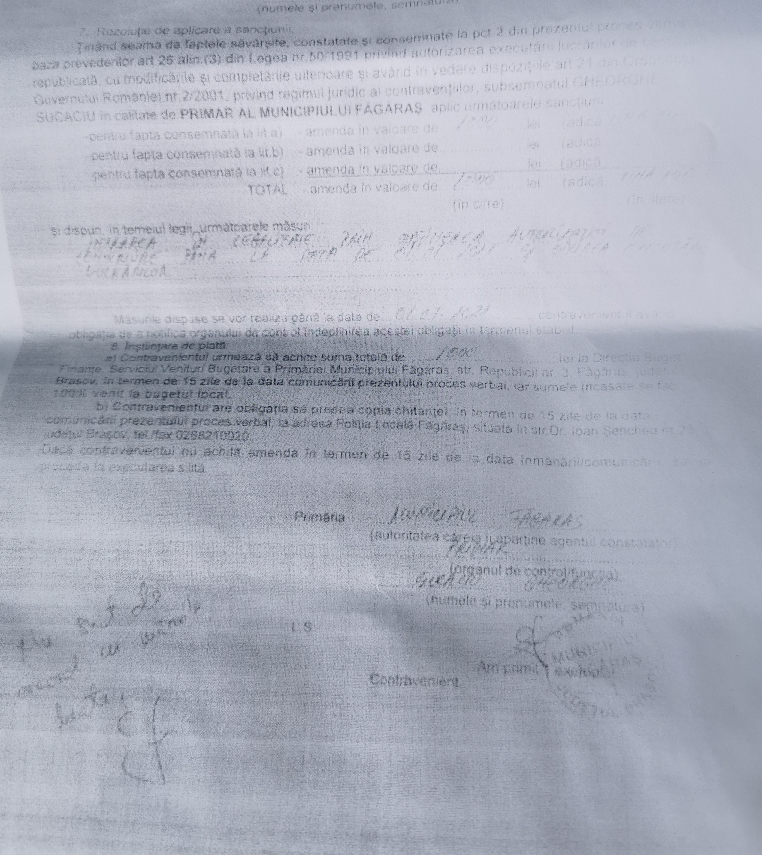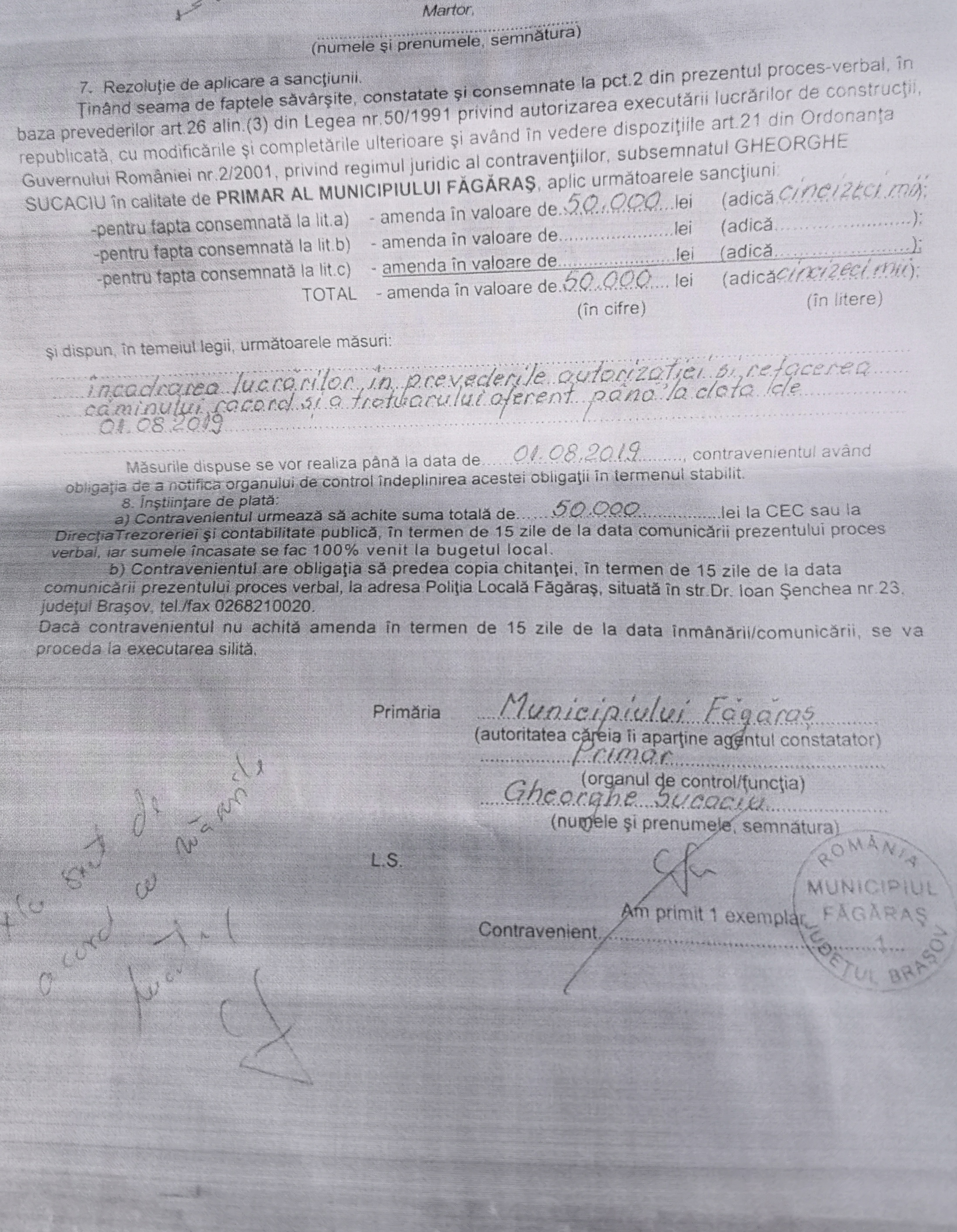 În privinţa abuzului în serviciu, un document relevă intervenţia primarului asupra funcţionarilor publici. Mai précis în cazul unor procese verbale de contravenţie emise de Poliţia Locală Făgăraş şi care se dorea a fi retrase din pixul primarului. Un proces verbal (nr. 8) emis la data de 21 iunie 2019 sanţiona un făgărăşean cu amendă de 50.000 lei pentru că ,,s-au executat lucrări de construire branşament apă canal cu nerespectarea AC nr. 69 din 17 .12.2018 şi o PR nr. 19/2018 plansa nr. CR eliberat de SC …..SRL, în Făgăraş, str. Republicii nr. 23“. Agentul constatator a impus ,,încadrarea lucrărilor în prevederile autorizaţiei şi refacerea căminului record şi a trotuarului aferent până la data de 1.08.2019“. Numai că primarul a trecut peste prevederile legale şi peste sancţiunea aplicată de autoritatea locală în domeniu şi a scris şi semnat pe procesul verbal întocmit de poliţistul local: ,,Nu sunt de acord cu măsurile luate“. În condiţiile în care ilegalitatea era clară.