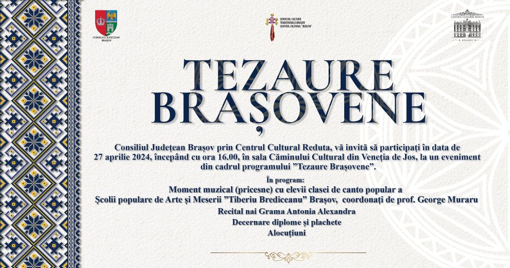 Satul Veneția de Jos va prinde viață în ziua de 27 aprilie a.c. începând cu ora 16.00. La Căminul Cultural va fi organizat un eveniment cultural dedicat tradițiilor locale. Manifestarea este organizată de Consiliul Județean Brașov prin Centrul Cultural Reduta, fiind parte din programul ,,Tezaure Brașovene“. Publicul va fi încântat să asculte un concert de pricesne al elevilor clasei de canto popular de la Școala Populară de Arte și Meserii ,,Tiberiu Brediceanu“ Brașov, coordonați de prof. George Muraru. Antonia Grama va avea un recital la nai. În cadrul evenimentului vor fi decernate diplome și plachete.