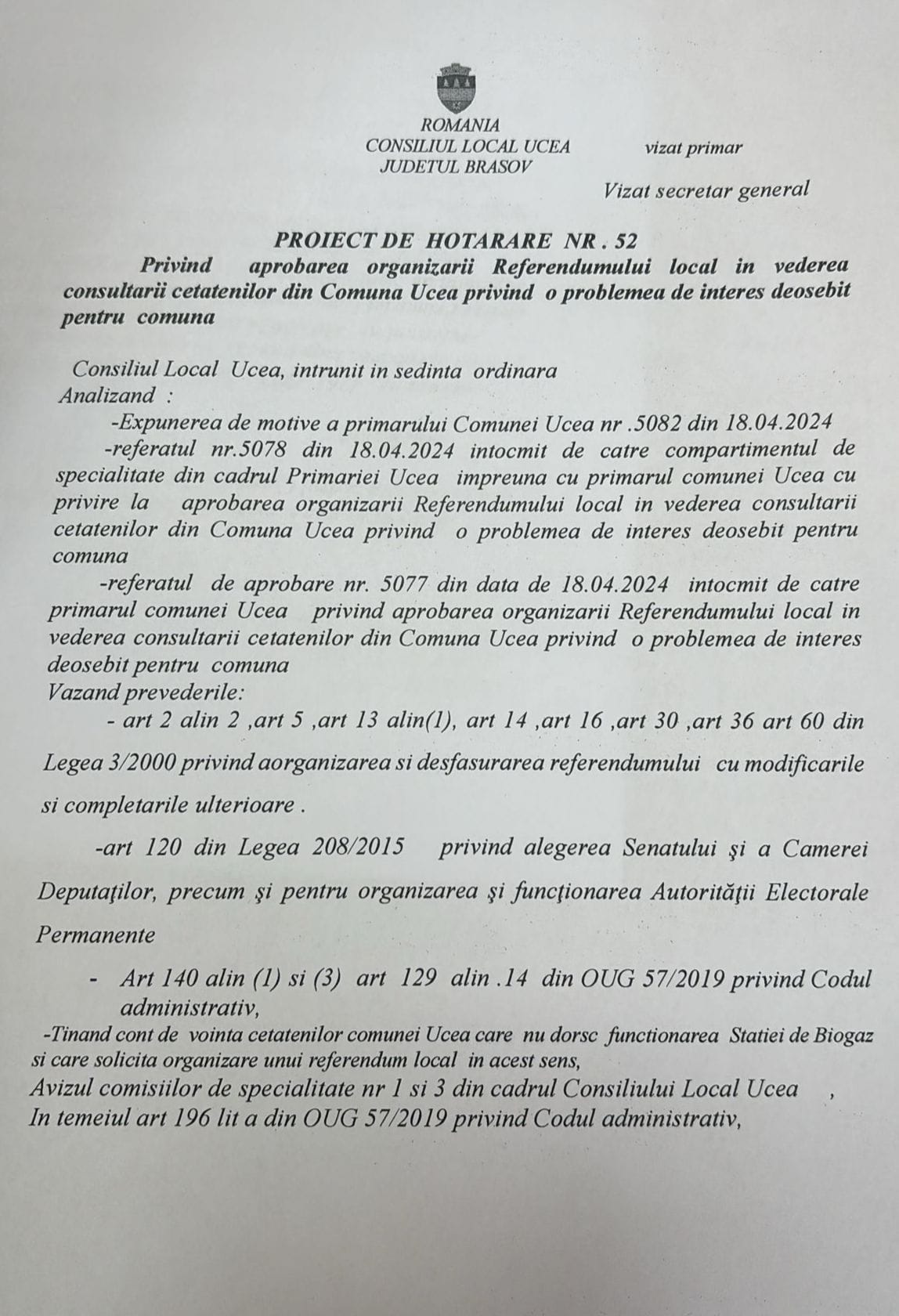 - ,,Ne găsim într-un moment crucial pentru comunitatea noastră. Recent, am depus eforturi considerabile pentru a proteja mediul înconjurător și calitatea vieții noastre aici la Ucea. Așadar, împreună cu Primăria și cetătenii am făcut pași importanți pentru a preveni functionarea în comuna noastră a stației de biogaz. În aceste sens, am intocmit proiectul de hotărâre cu privire la aprobarea organizării unui referendum local, urmând a fi aprobat în cadrul ședinței consiliului local“ a explicat primarul comunei Ucea, Adrian Grovu.