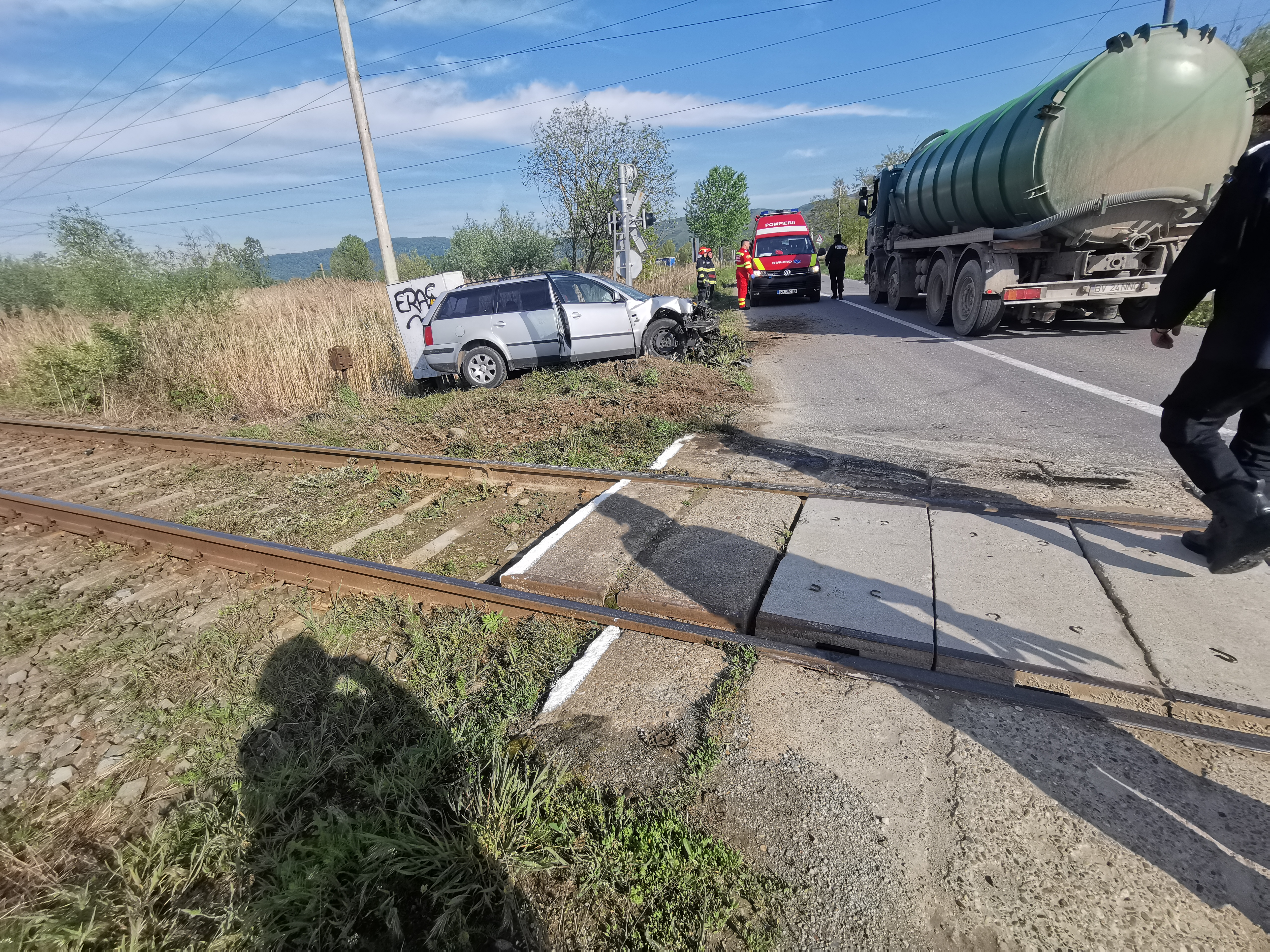 Foto. Mașină lovită de tren la Olteț. Făgărășeanul aflat la volan a scăpat cu viață, dar mașina a fost făcută zob